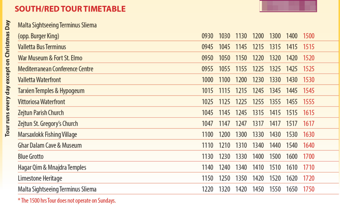 You may refer here for the South Red Tour timetable