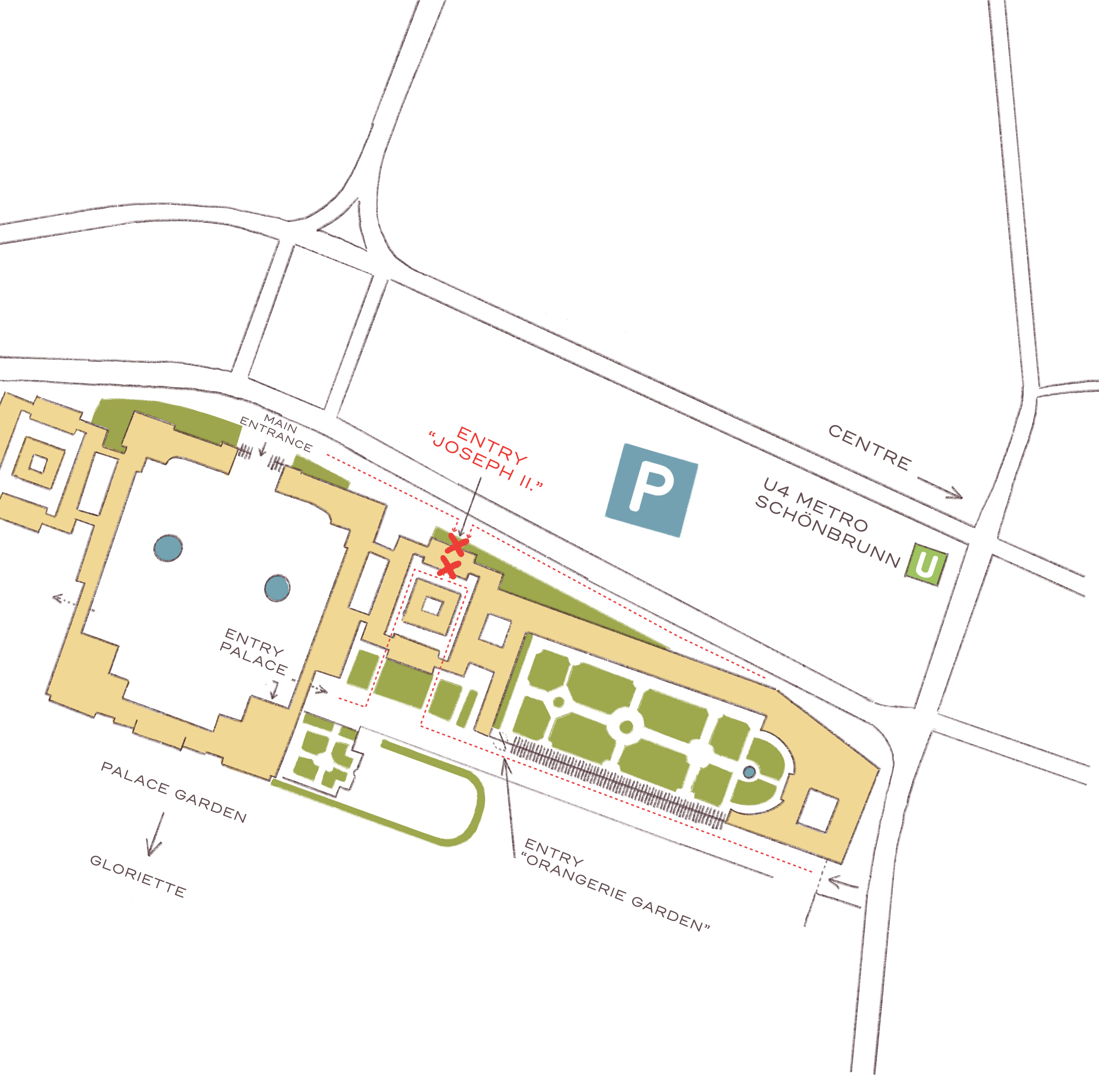 The restaurant is situated between the Orangery and the main entrance of Schoenbrunn Palace, across from the Schoenbrunn bus parking lot