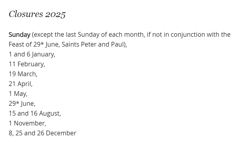 The Vatican Museums are open on the last Sunday of each month, except on designated closure dates. Opening hours are from 09:00 to 14:00, with final entry at 12:30