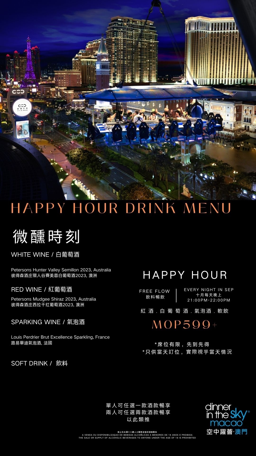 - Contact Dinner In The Sky Macao: Call or message WeChat (+853 6396 6644 / DinnerInTheSkyMacao) to check date availability