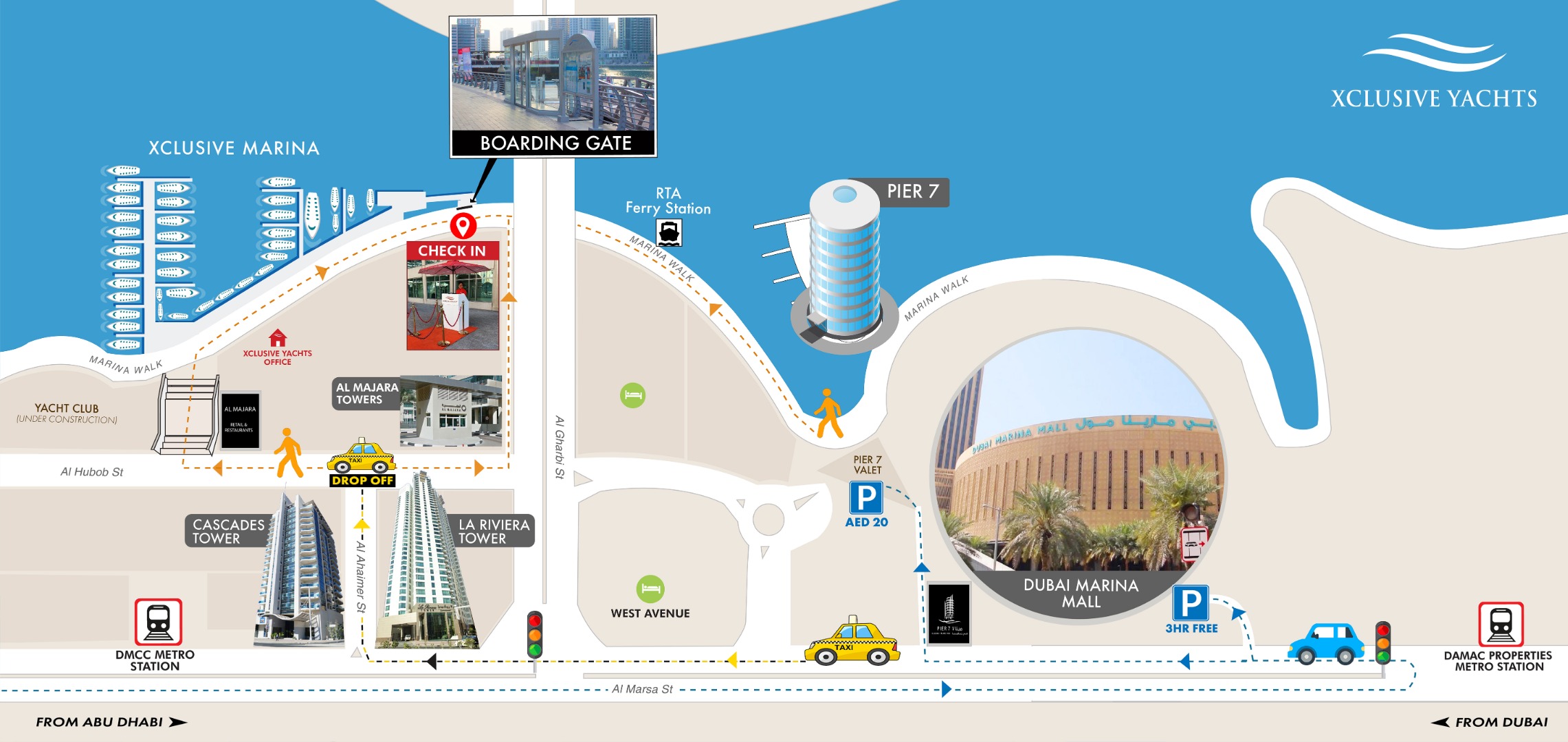 You can park your car at Marina Mall (3-hours free). Or use the valet parking at Pier 7 (please validate your ticket at the departure point, AED 20 charges apply)