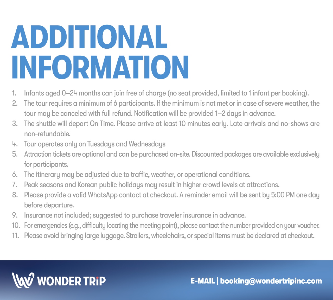 • Departure: Meet the operator at 07:15 - 07:30. Enter your preferred location at checkout. The operator will make the final confirmation accordingly. Depart at 7:30am on time