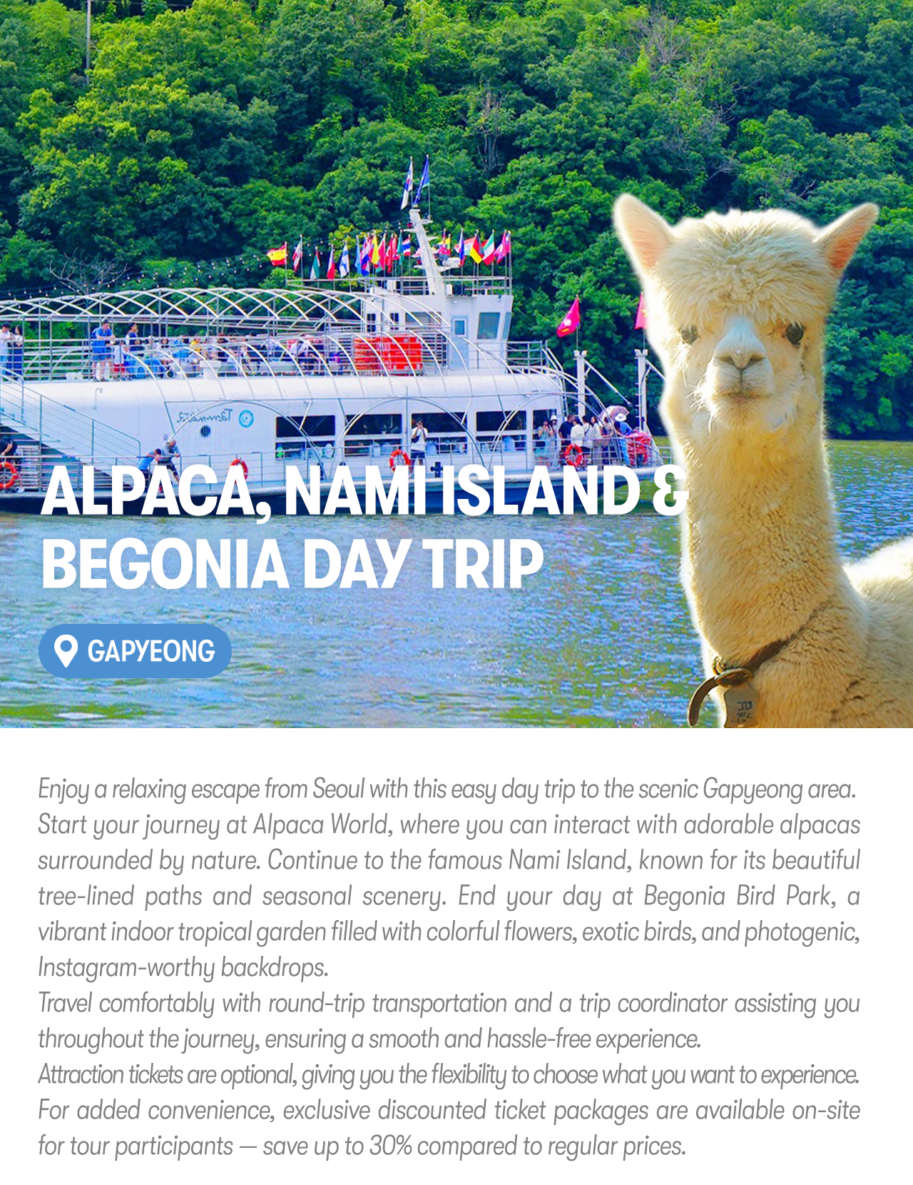 Alpaca, Nami Island & Begonia Day Trip from Seoul| Easy Bus Tour