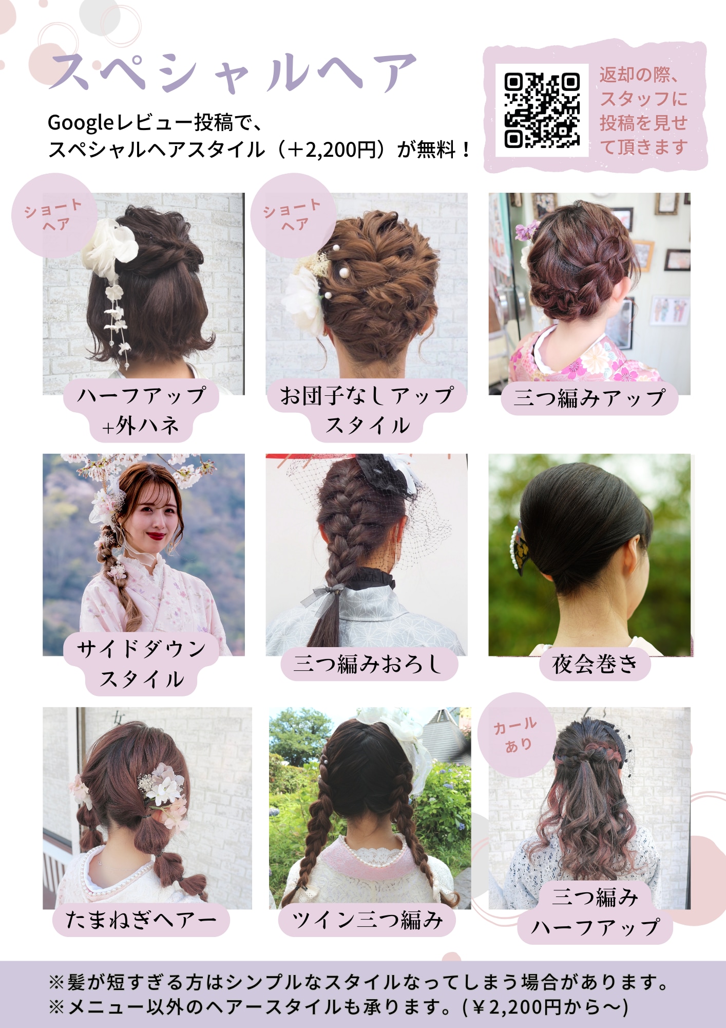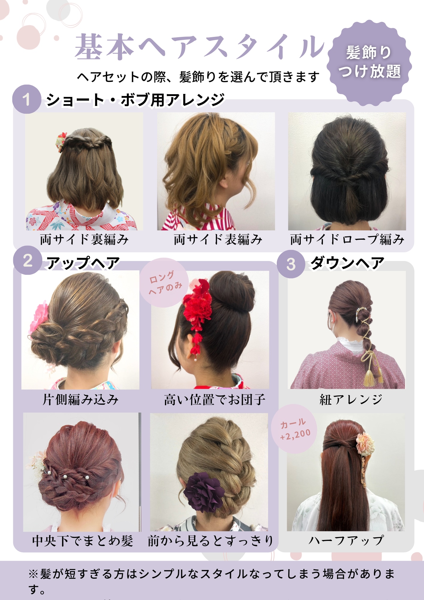 - The hairstylist will provide simple styling services such as braiding. Please inform the staff whether you prefer an updo or to wear your hair down, as well as how you would like your bangs styled. All other details will be handled by our professionals.
