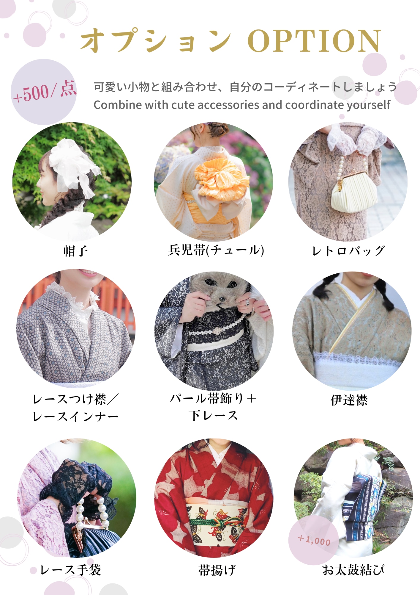 - You can freely choose to purchase various accessories in the add-on area (hats, heko obi, retro handbags, date collars, pearl belts, lace gloves, etc.).