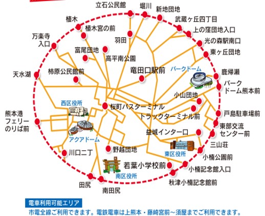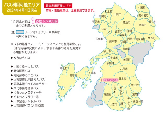 - Wakuwaku 1-Day Pass Area Designation ②: Local buses within the applicable area (excluding Kumamoto Bus until March), city trams, and electric railway 1-day pass fare (Area Designation ② only)