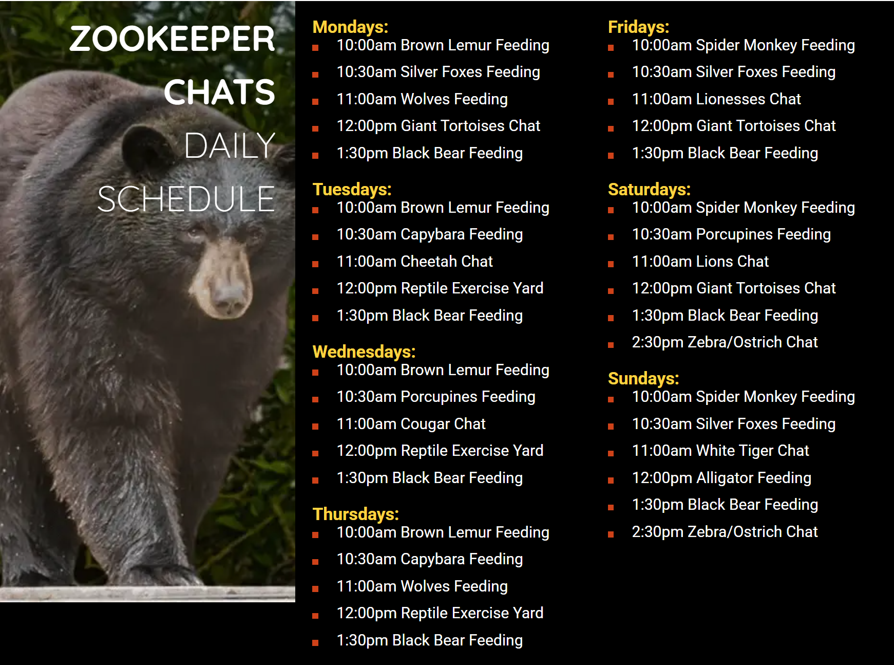 - Zookeeper chats daily schedule: Please referhere for zookeeper chats sharing fascinating insigghts and heartwarming tales from the frontlines of animal care