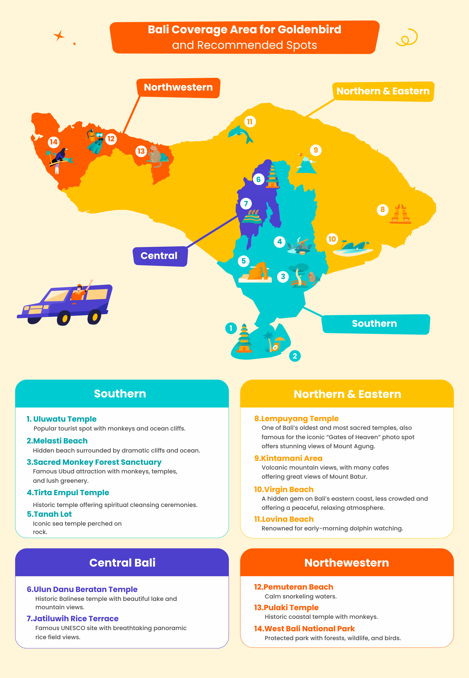 - INFO! Our driver will be happy to recommend and guide you to all the popular places based on the area you would like to go, so be sure to check it out!