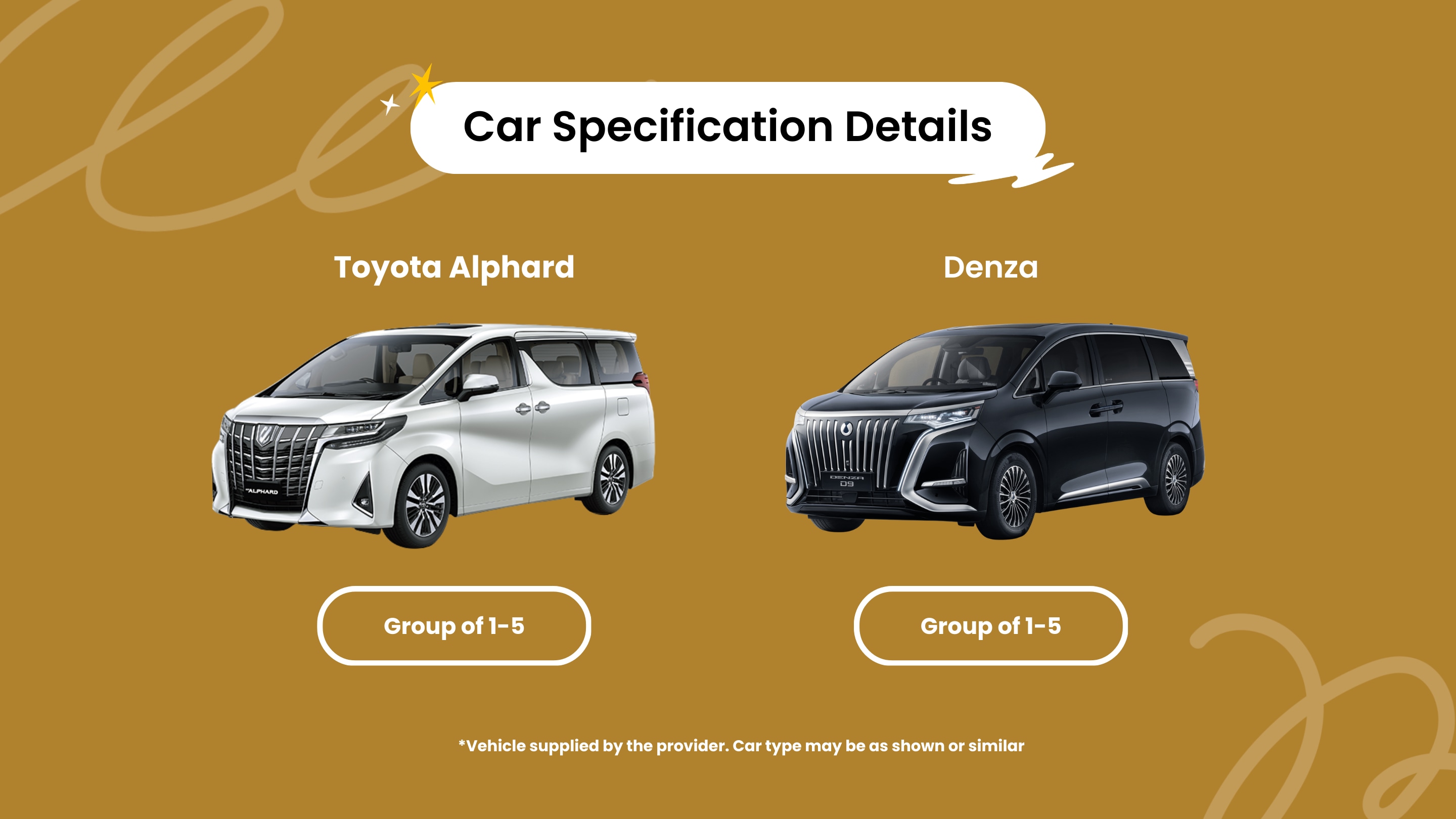 Important: Group size is up to 5 passengers if traveling without luggage. If your group exceeds this maximum, please book a bigger or additional vehicle