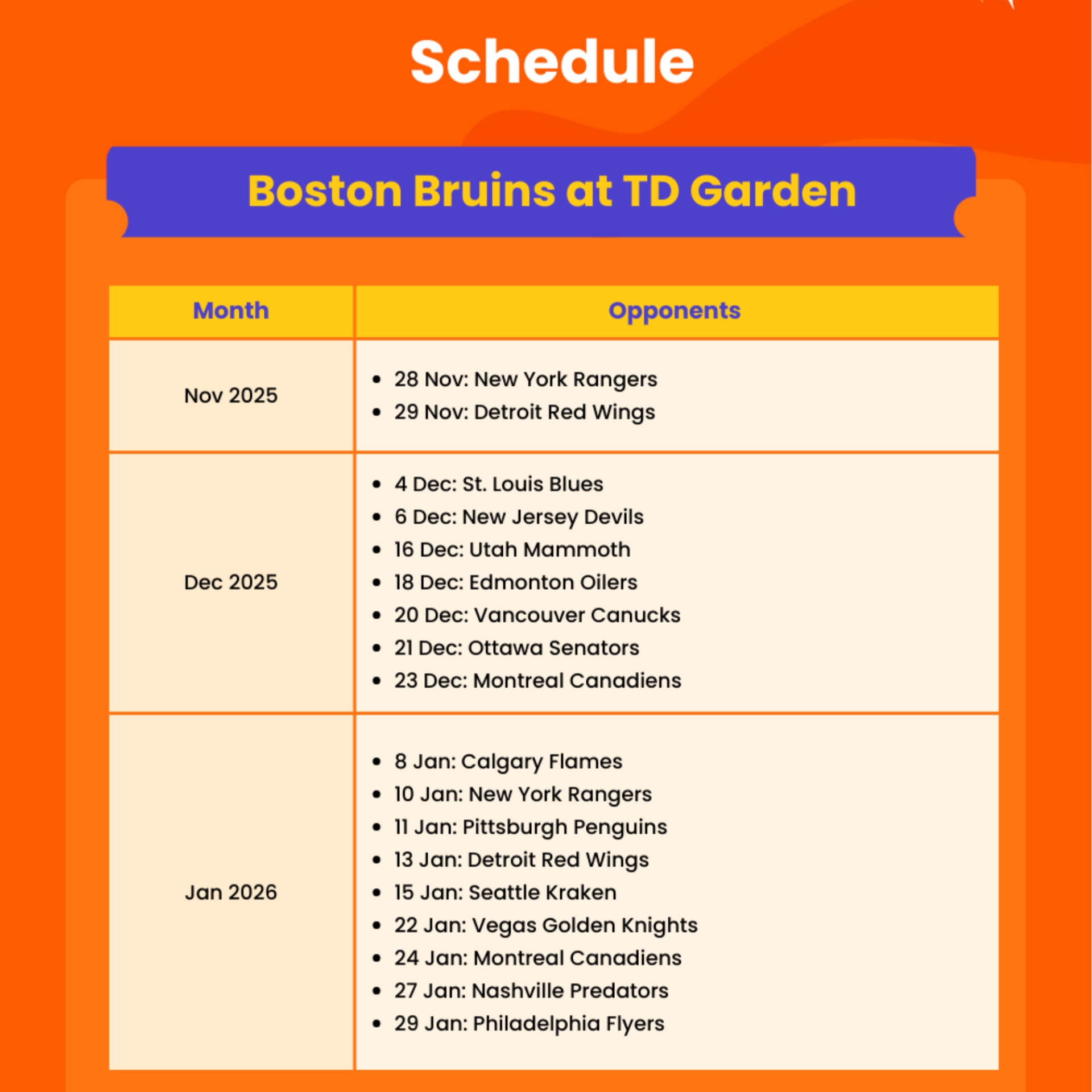 - Admission to: Boston Bruins Ice Hockey Game at TD Garden