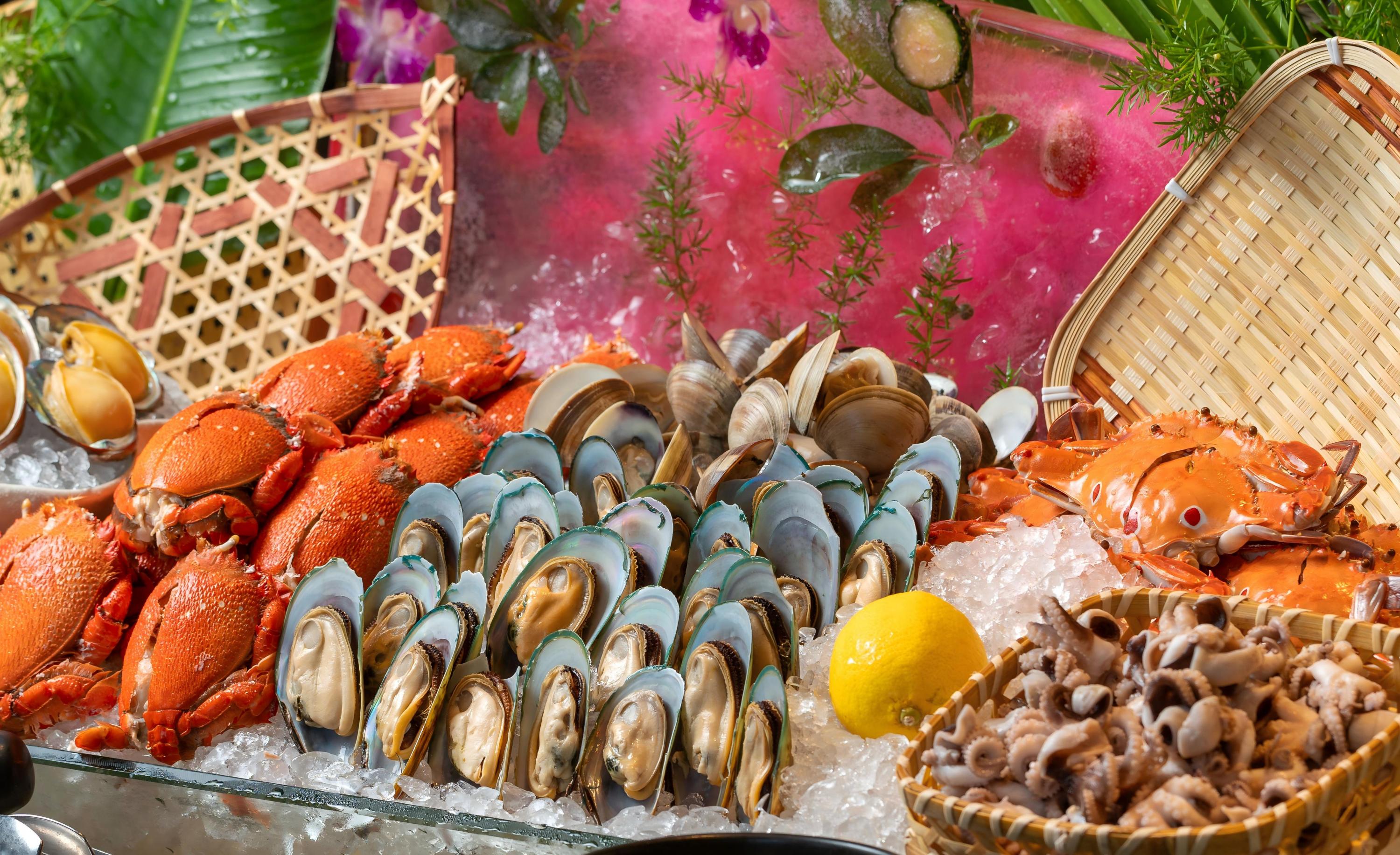 - [Seafood Section] Norwegian salmon, Japanese sweet shrimp, Hokkaido scallops, sea crab, scallops, abalone, Vannamei shrimp, sea snails, mantis shrimp, baby squid, red herring roe, yellow herring roe, octopus, white jade pork, amberjack, vegetarian sea cucumber, vegetarian abalone