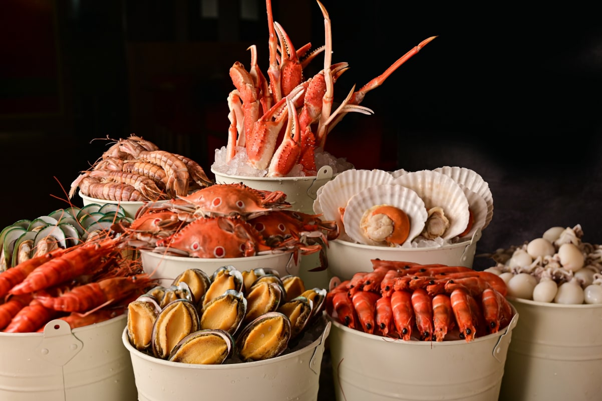 - Iced seafood pool: prawns, mussels, tiger crabs, emerald snails, baby squid, three-spot crabs, giant river prawns, snow crab legs