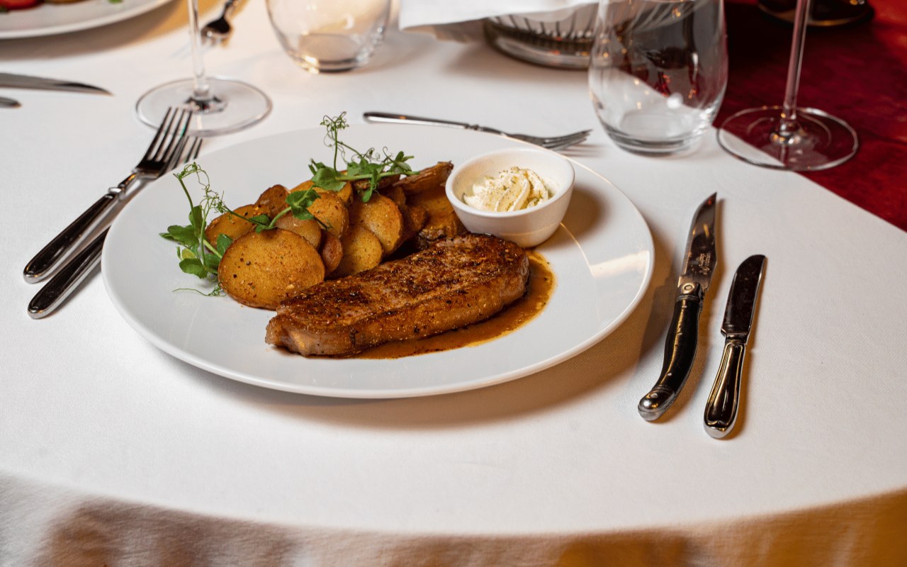 - Rib eye steak with herb butter and homemade chips