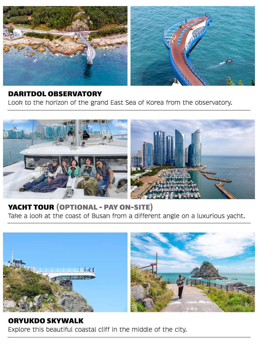 • During the peak season, the Yacht tour may be replaced by the Songdo Sea Cable Car, depending on availability.