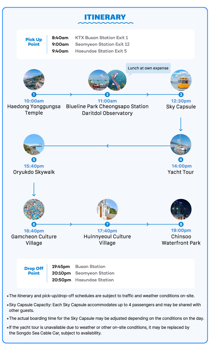 • [Attraction/experience] 12:30, 30 min(s), Blueline Park Sky Capsule, 13:00pm Arrive at Blueline Park Mipo Station and Leave for The Yacht Tour. The actual boarding time for the Sky Capsule may be adjusted depending on the conditions on the day.