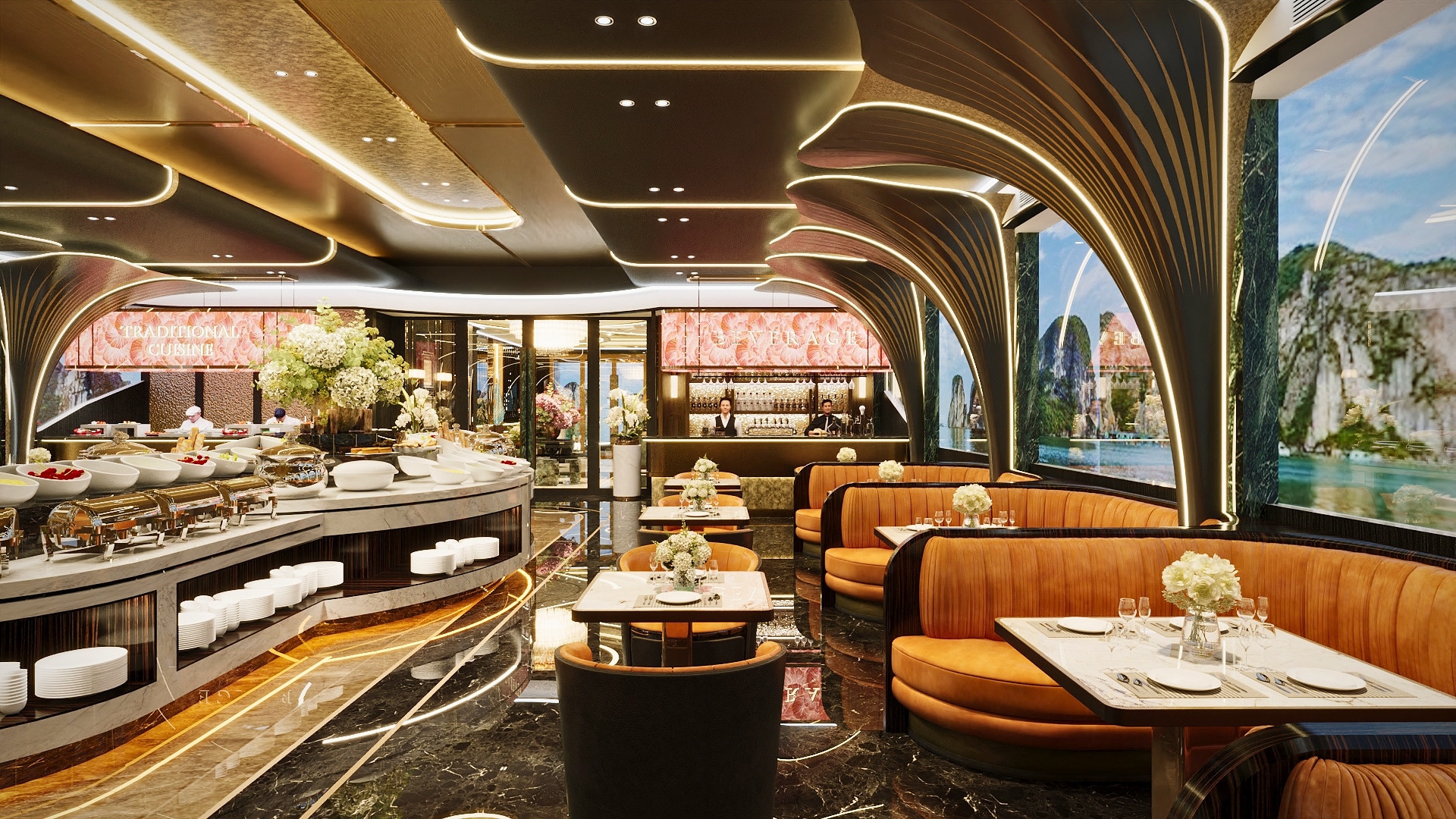 - [Attraction/experience] 14:30, Guided tour, Ha Long Bay, Enjoy a Afternoon Tea with live music, admire the scenic bay views, and unwind in the luxurious ambiance of the cruise.