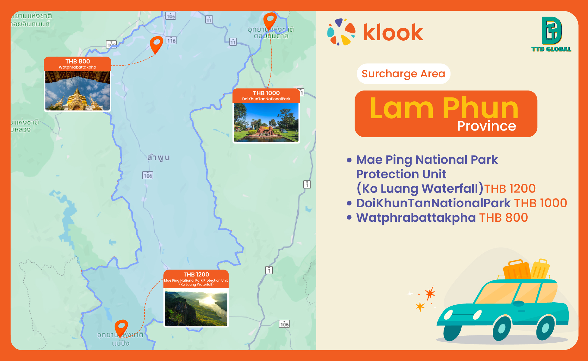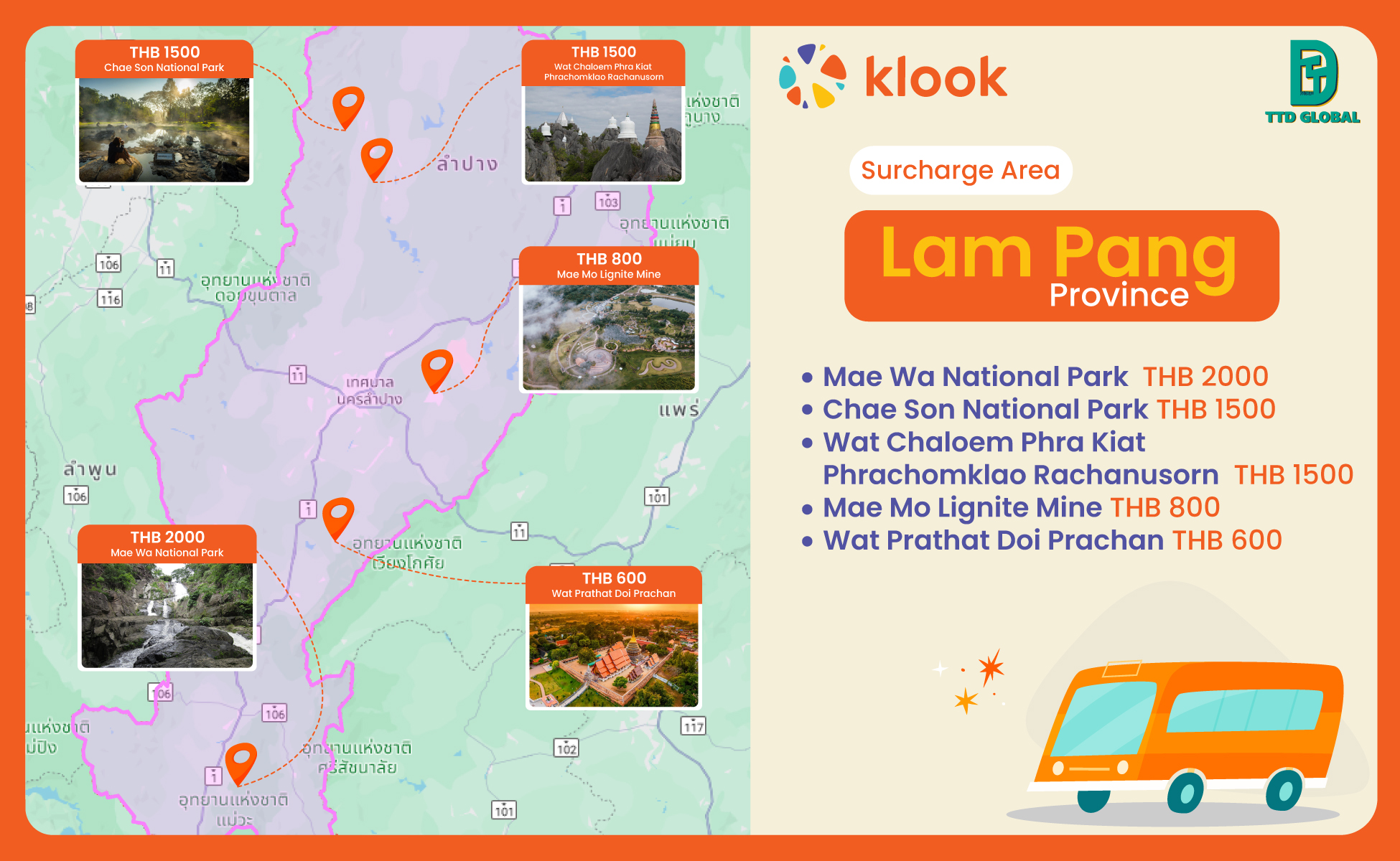 - Available route : Chiang Mai Downtown (Mueang Chiang Mai) - Lamphun - Chiang Mai Downtown (Mueang Chiang Mai)
