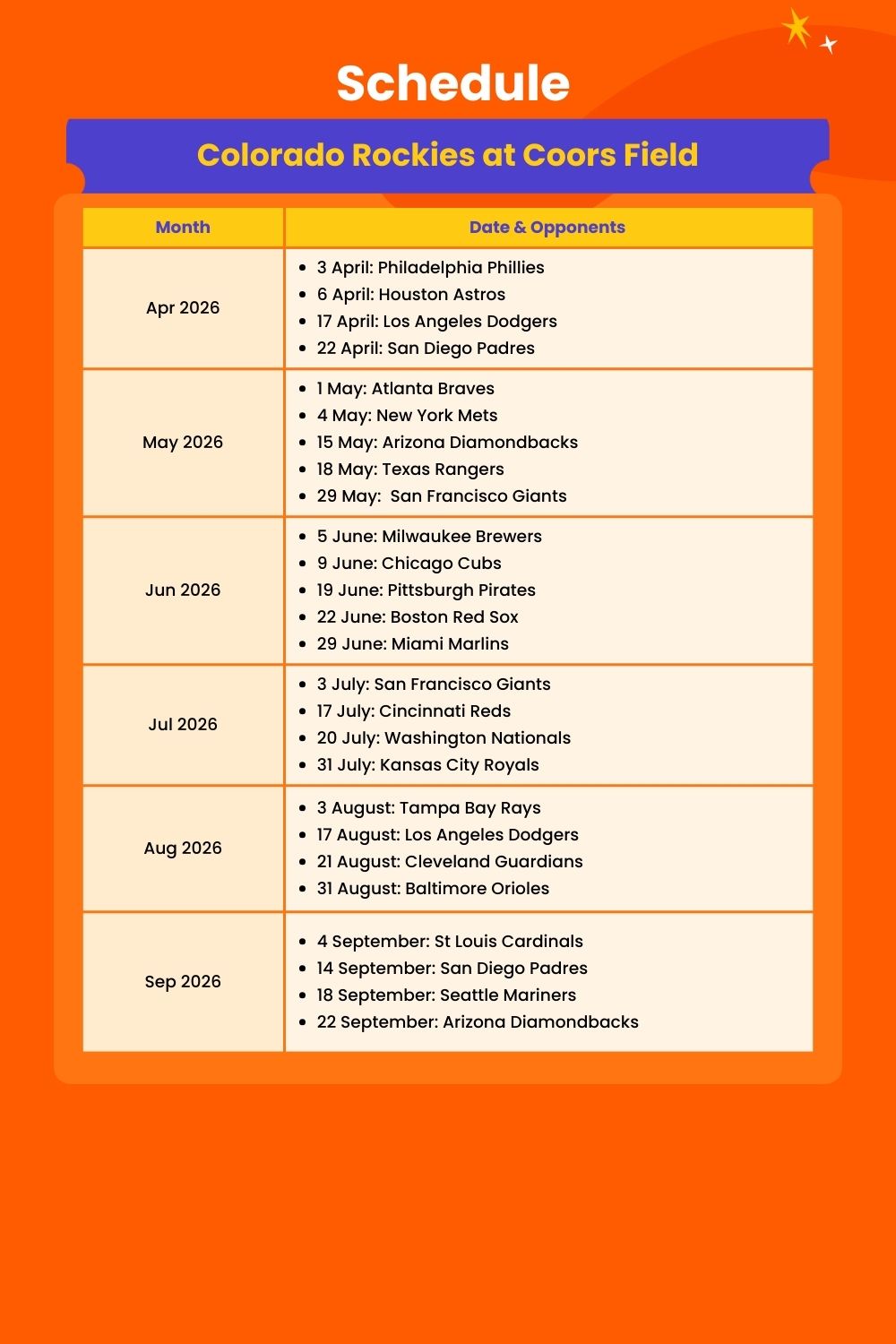 - Admission to: Colorado Rockies Baseball Game at Coors Field