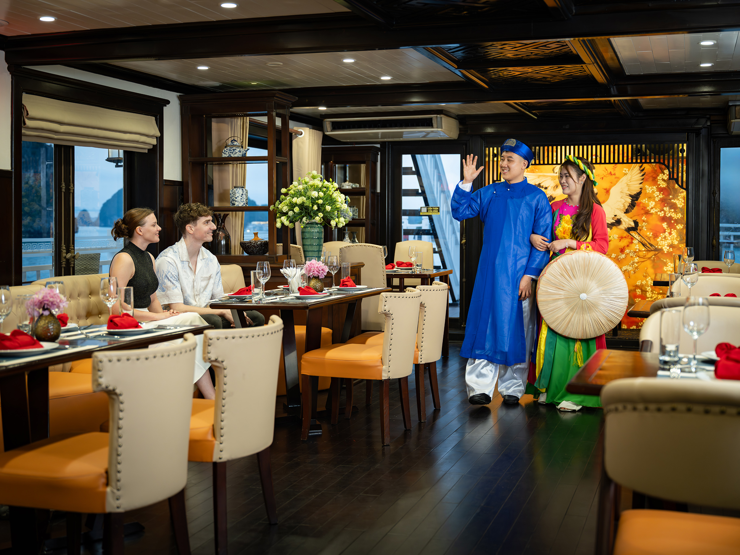 - [Dining] 19:00, Dinner, Enjoy a romantic dinner served at the restaurant while admiring the sparkling beauty of Ha Long Bay at night.