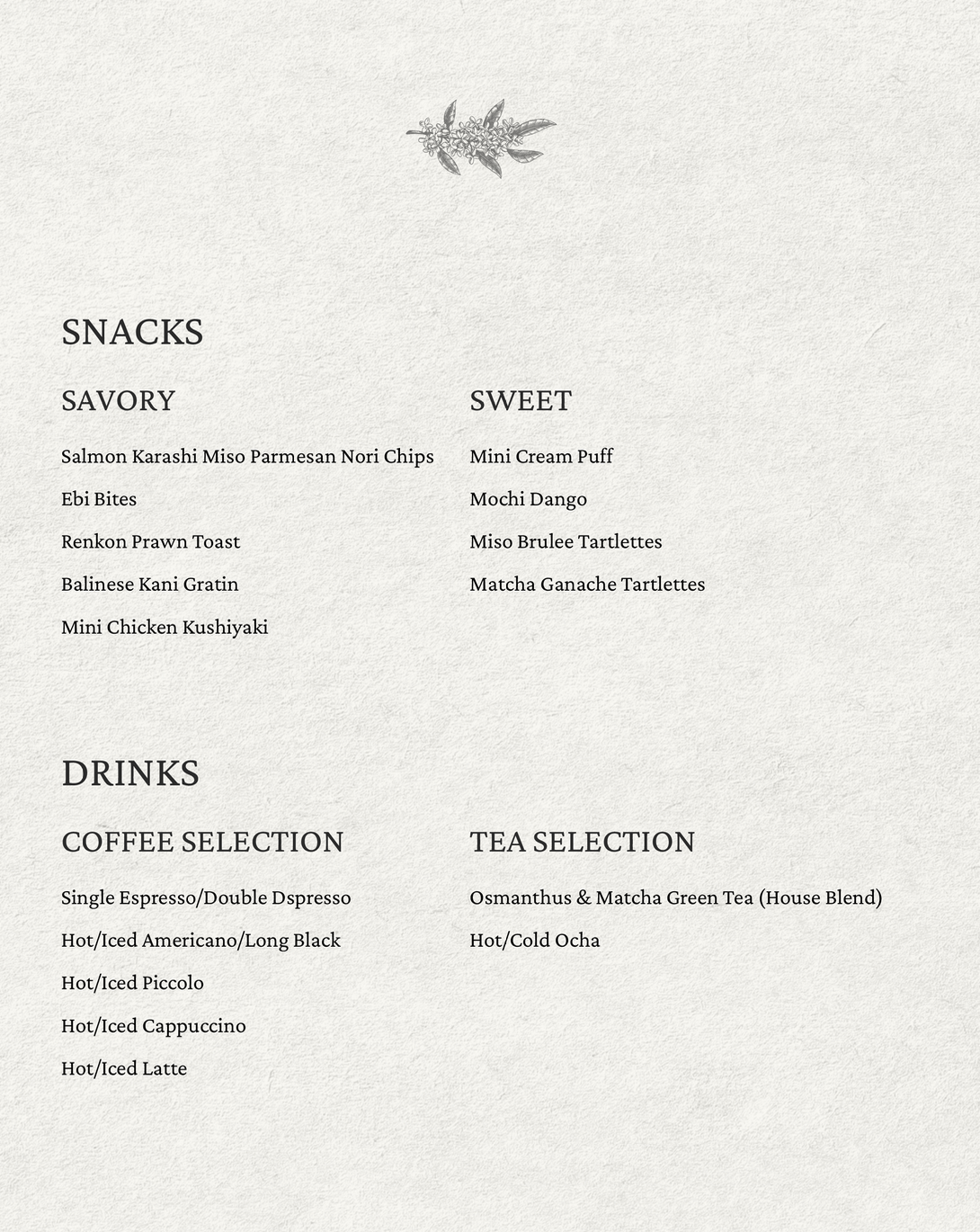 The menu on the page are for reference only and are subject to change. Actual availability is based on the seasonality, purchase of ingredients and stock without prior notice from the restaurant