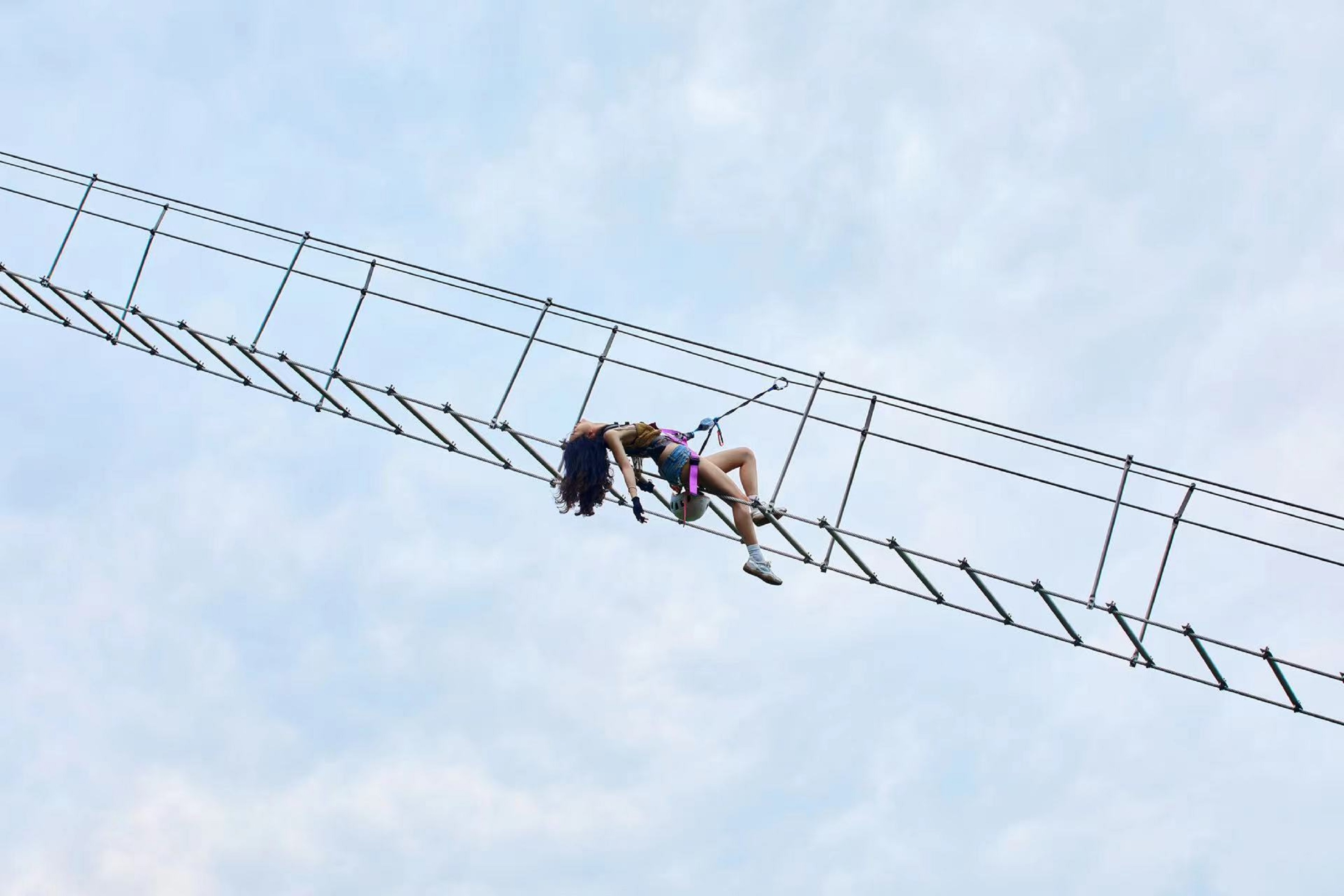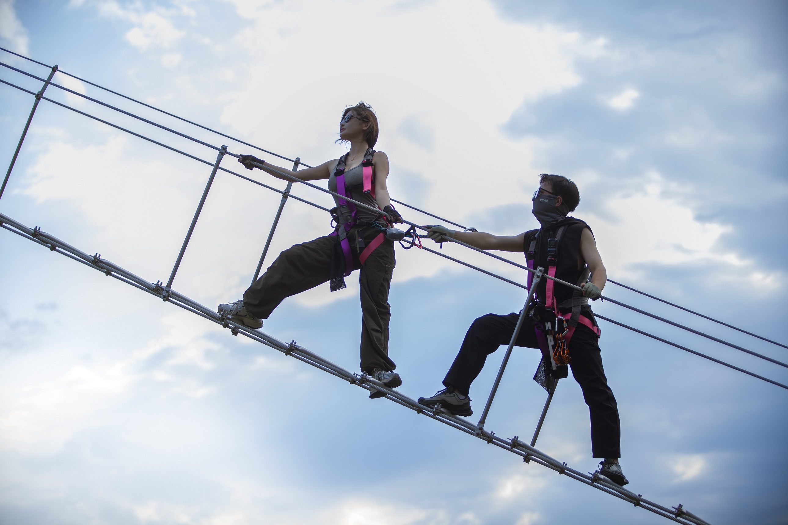 - Throughout the entire process, strictly adhere to the coach's instructions and do not remove safety equipment without permission. Refrain from running or playing on the steel cable plank road and aerial walkway, and maintain a safe distance. When taking photos, firmly grasp the safety rope and avoid leaning out excessively.