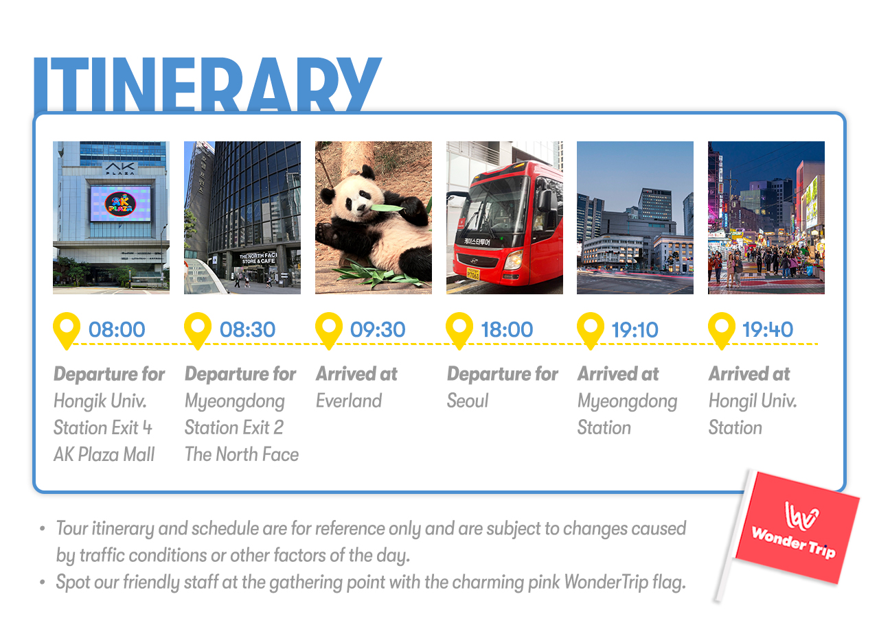 - Departure: Meet the operator at 08:00. Enter your preferred location at checkout. The operator will make the final confirmation accordingly. Hongik Univ. Station Exit 4, in front of AK Plaza.Please arrive at the location 10 mins before the departure time