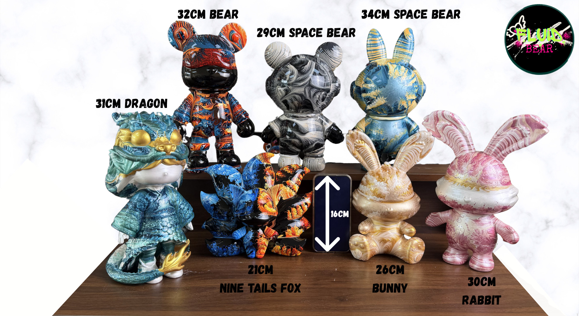 - 1x Selected figurine (choose one): Bear - 32cm / Bunny - 26cm/30cm / Nine Tail Fox - 21cm / Dragon - 31cm / Space Bear - 29cm / Space Bunny - 30cm / Reindeer - 29cm