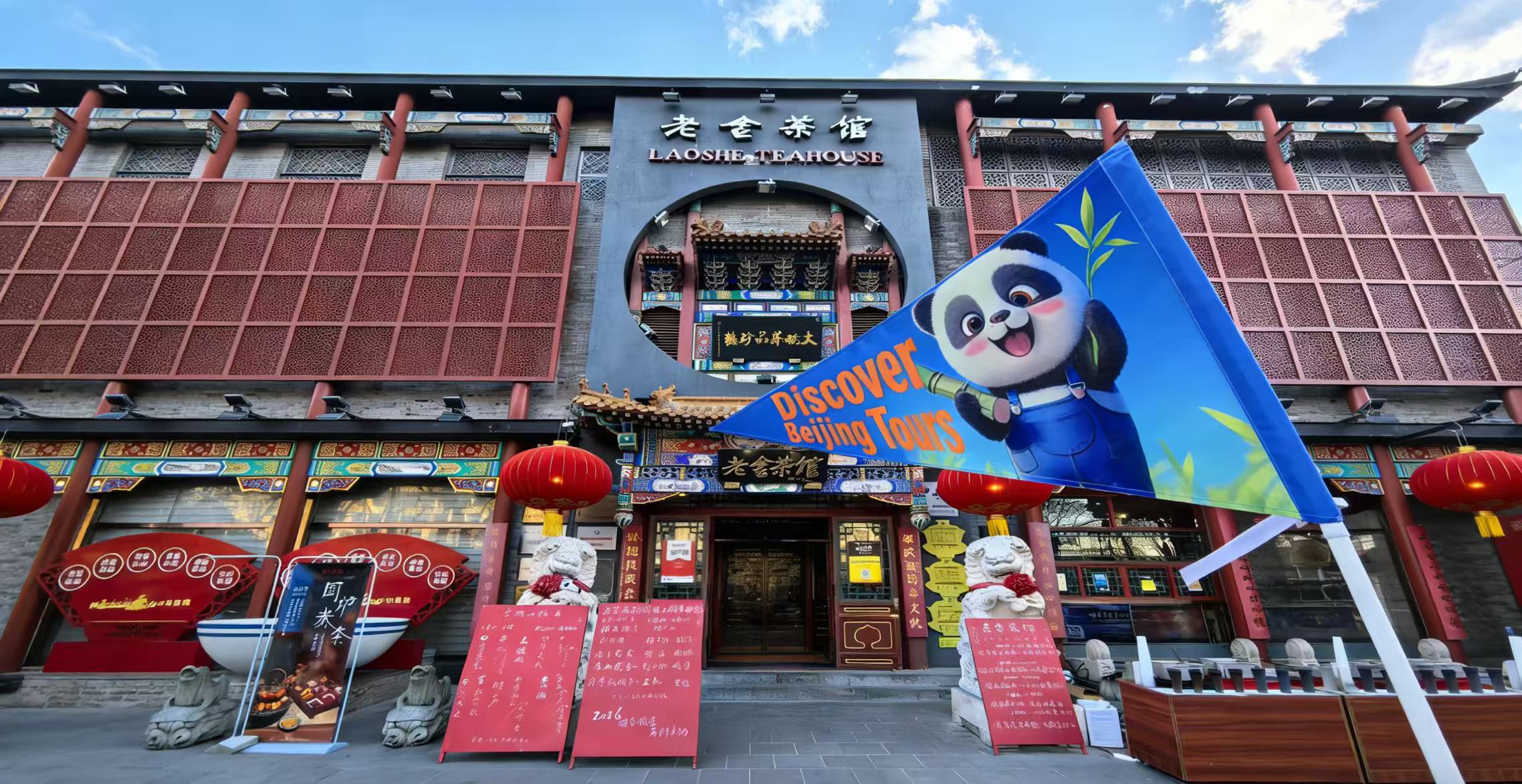 - Please look for the Panda Flag in front of Lao She Teahouse. You can come by taxi; here is the Chinese address: 请带我去老舍茶馆,前门西大街正阳市场 3 号楼. You can also take Subway Line 2 to Qianmen Station, exit C, then walk about 300 meters. Please note: Do not go to the Tian’anmen Square area, as a reservation is required to enter. If you take the subway, please get off at Qianmen Station only, not Tian’anmen East or West Station. Please arrive 10 minutes early. We recommend arriving ahead of time as we will depart promptly on schedule. Please do not be late, otherwise you will not be able to enter the square or join the group.