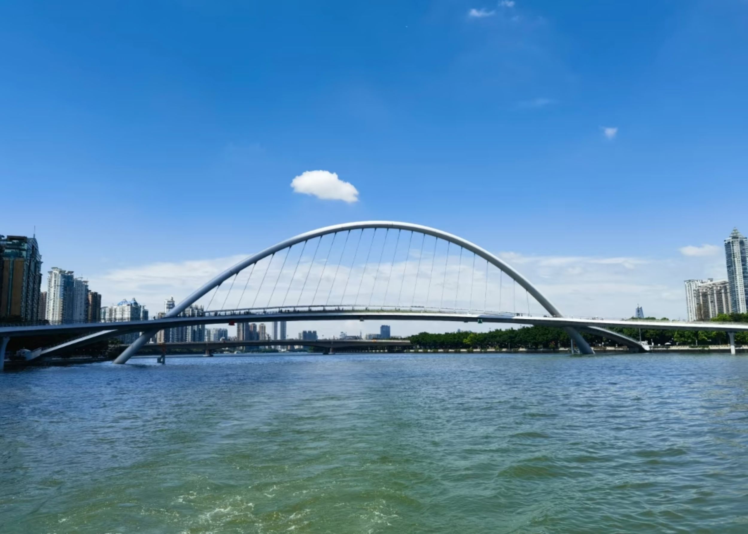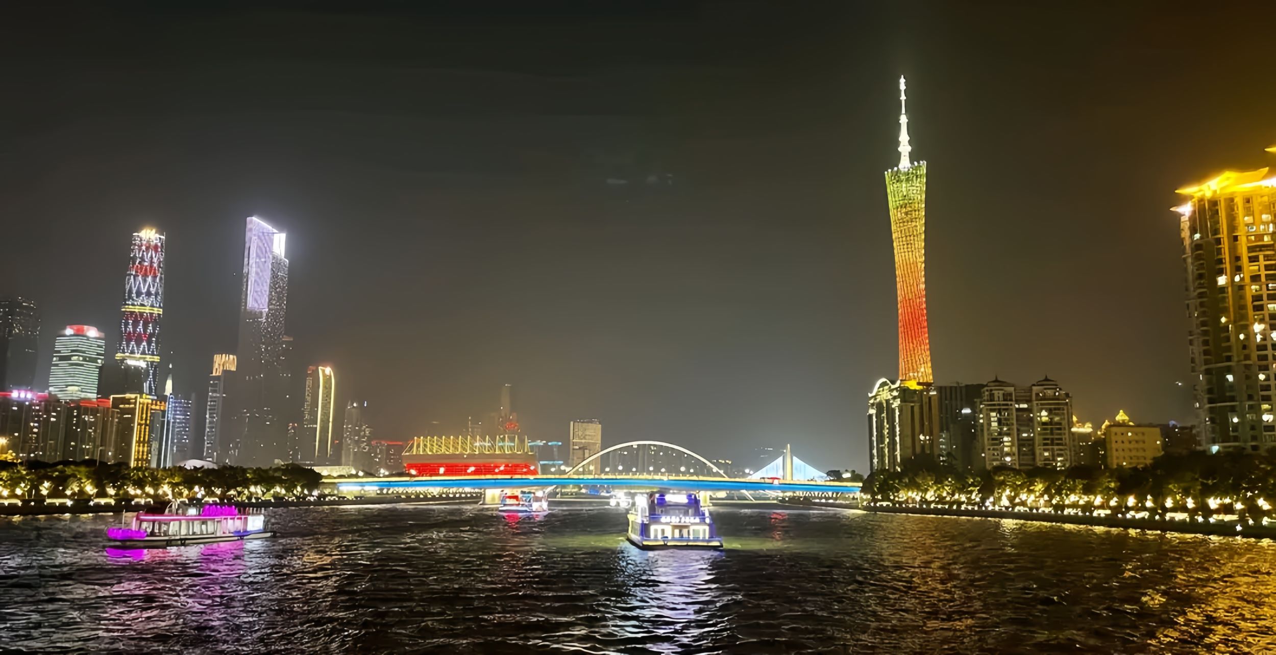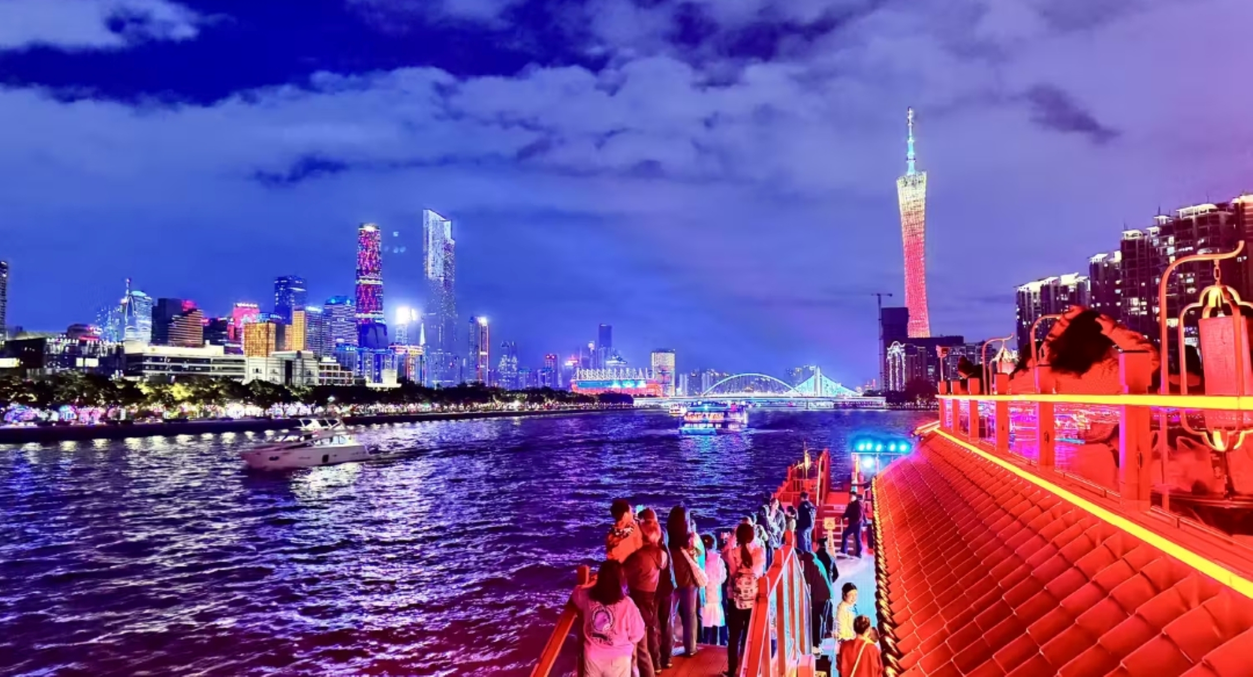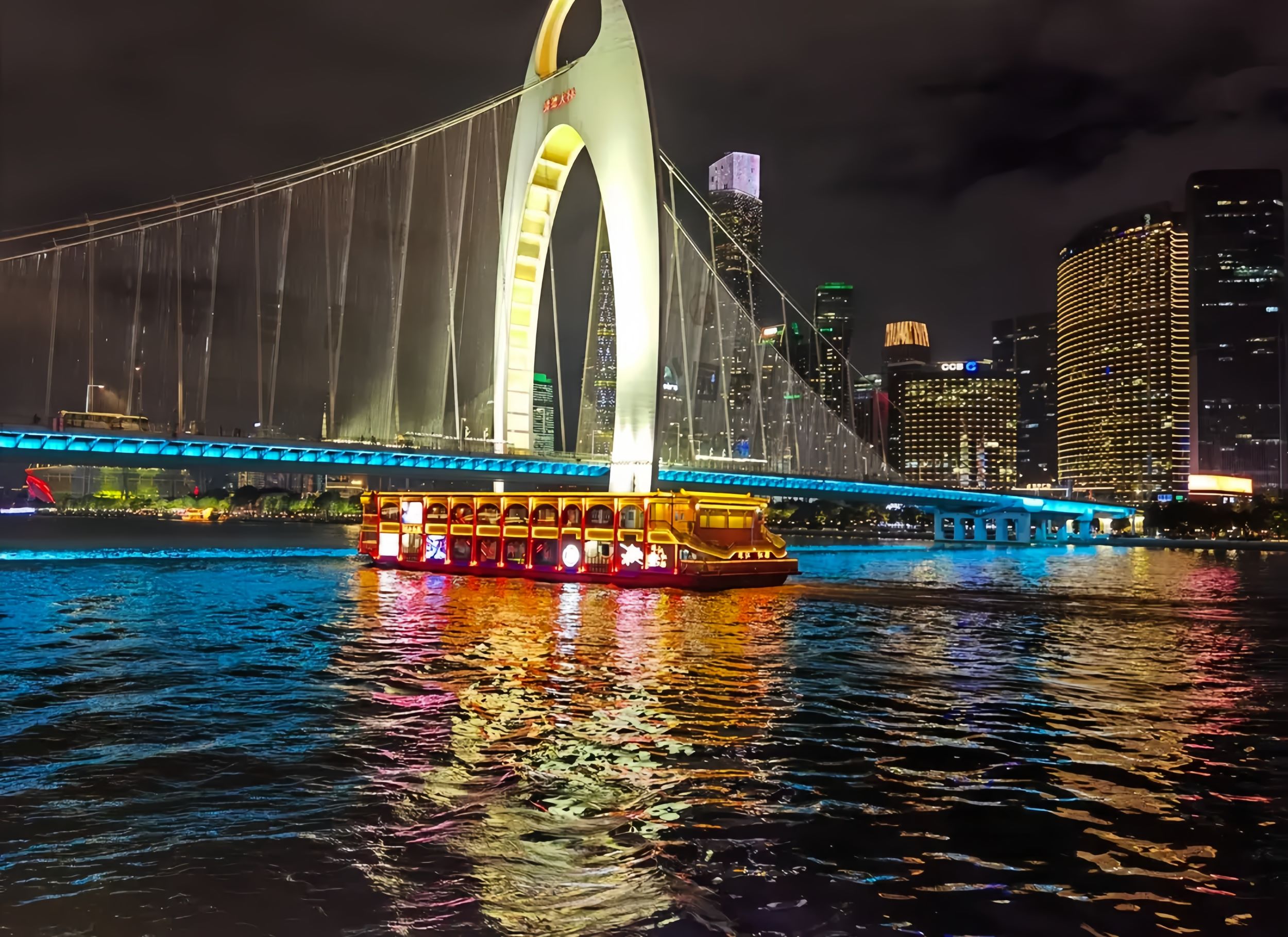 - [Attraction/experience] 1 hour(s), Self-guided, 江湾桥, Haixin Bridge, Canton Tower, Enjoy the shimmering lights of the Jiangwan Bridge and Haixin Bridge aboard the Yuebo, accompanied by the colorful lights of the Canton Tower reflecting on the river. The Pearl River night cruise takes in Guangzhou's landmark clusters, offering a full view of the city's nighttime charm. The duration is for reference only, and the actual duration shall prevail.