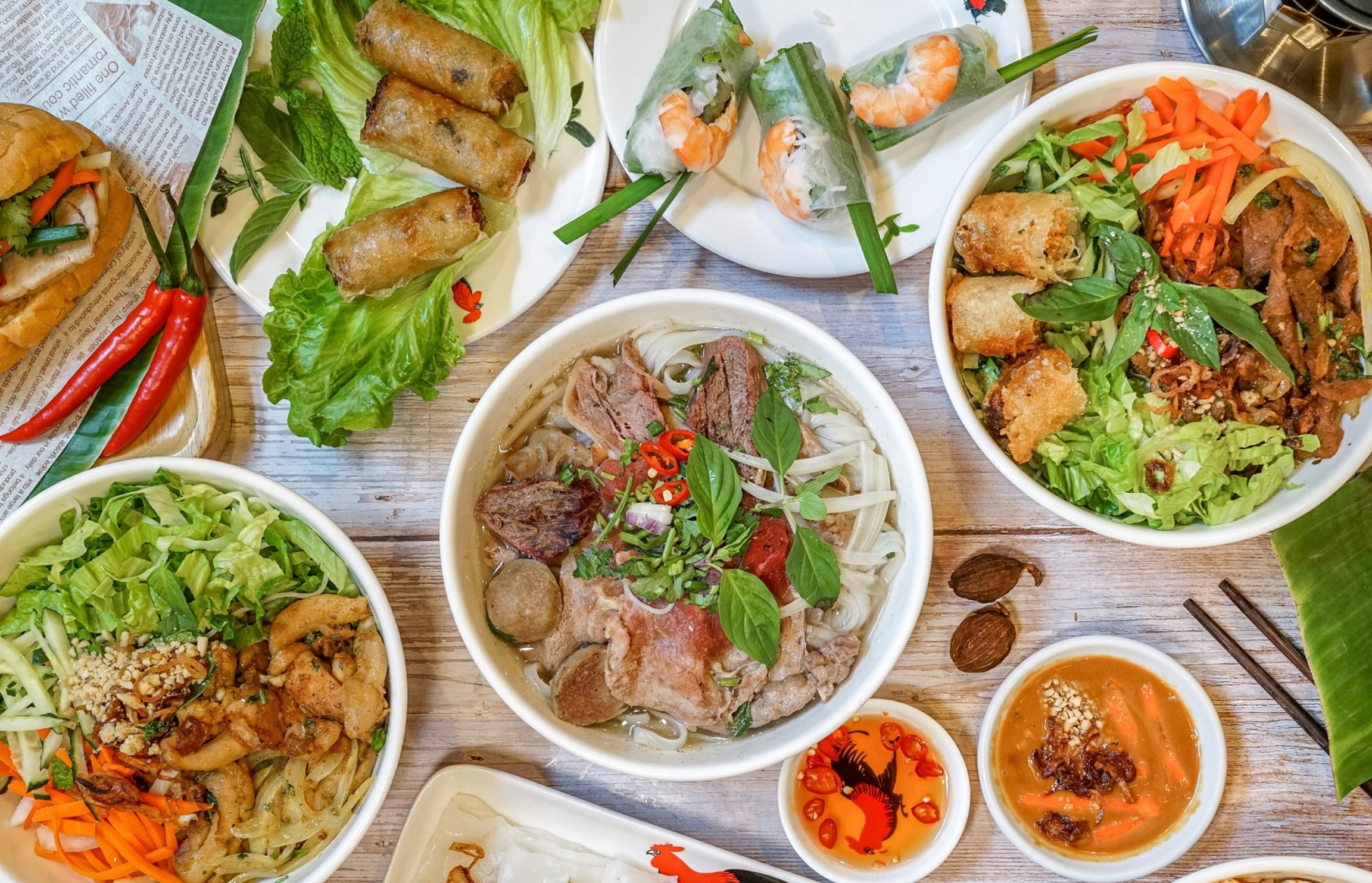 - Bún Bò Huế — a rich, flavorful beef noodle soup that’s distinct from the more widely known Phở found across Vietnam. Broth Ingredients: lemongrass, beef bones, pineapple, shrimp paste. Other Ingredients: crab sausage, beef brisket, spring onions, onions.