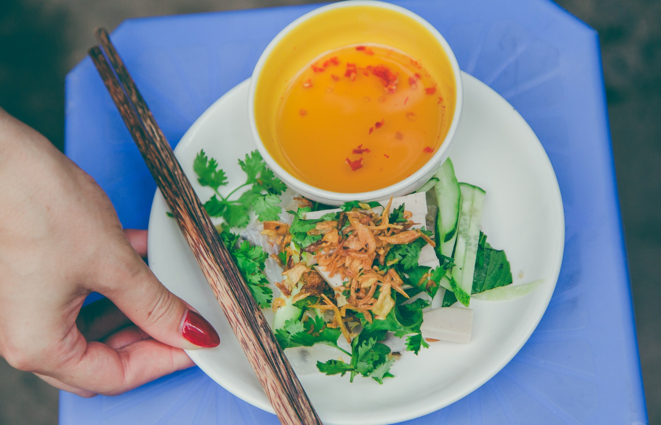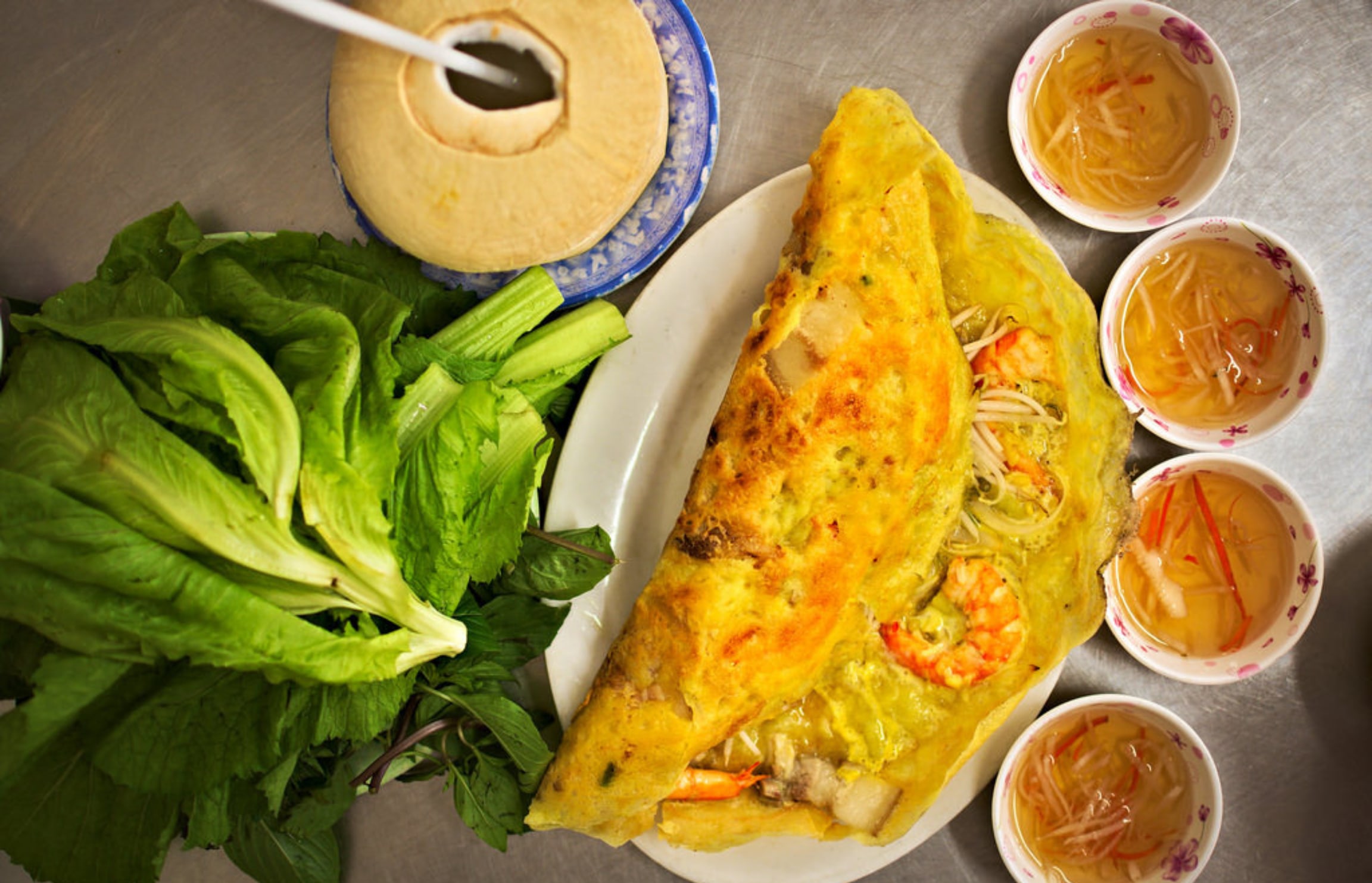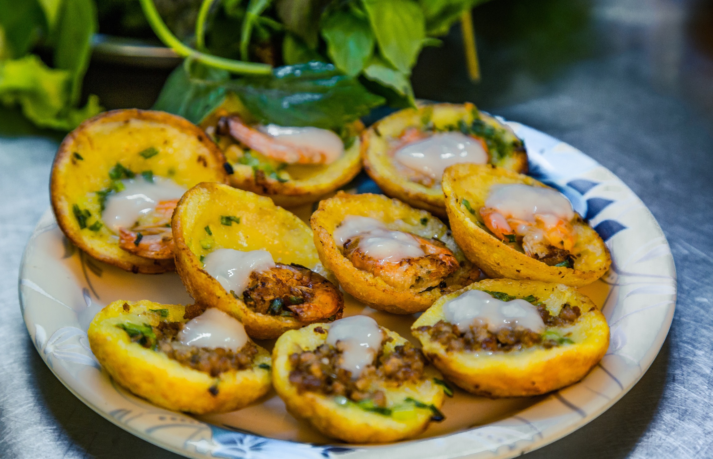 - Bánh Khọt, crispy savory pancakes topped with shrimp, accompanied by fresh herbs, greens, and a flavorful dipping sauce.