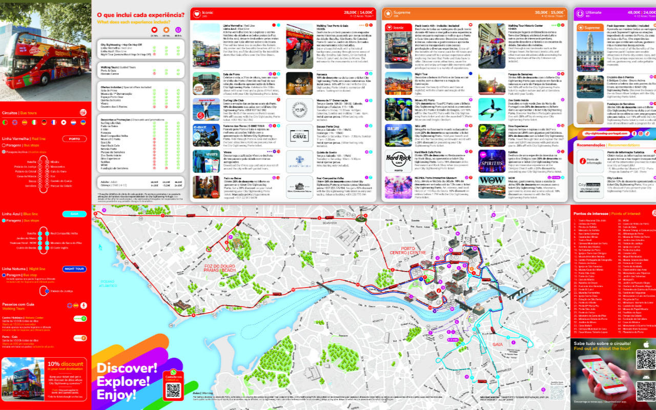 Please note that by presenting your City Sightseeing Porto ticket, guests can enjoy a free glass of port wine at Tapas 65 or Must with a meal, a free beer or soft drink with a hamburger at Bonche Grill, discounts on e-bike tours, FC Porto Tour, Sea Life Centre Porto, Hard Rock Cafe Porto, NEONIA Museum, Parque de Serralves, Zoo Santo Inacio, Spiritus exhibition, WOW museums, Dino Experience, and a free self-guided walking tour