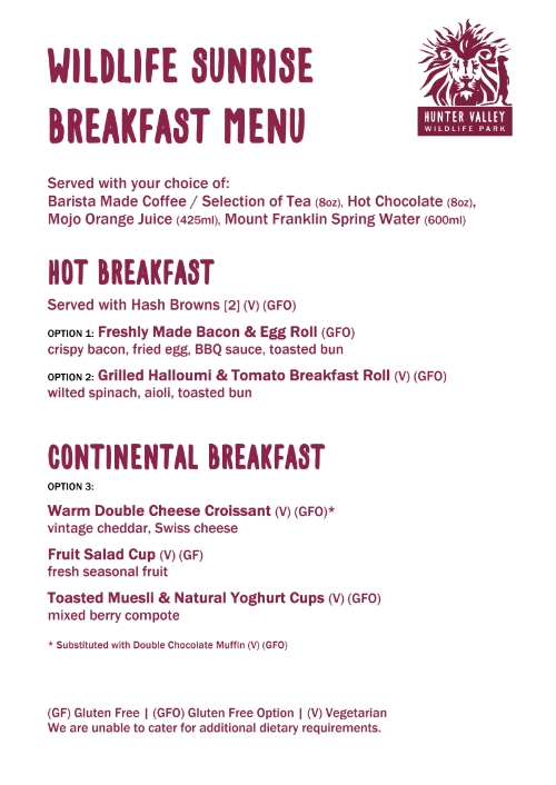 - Admission to: Hunter Valley Wildlife Park only