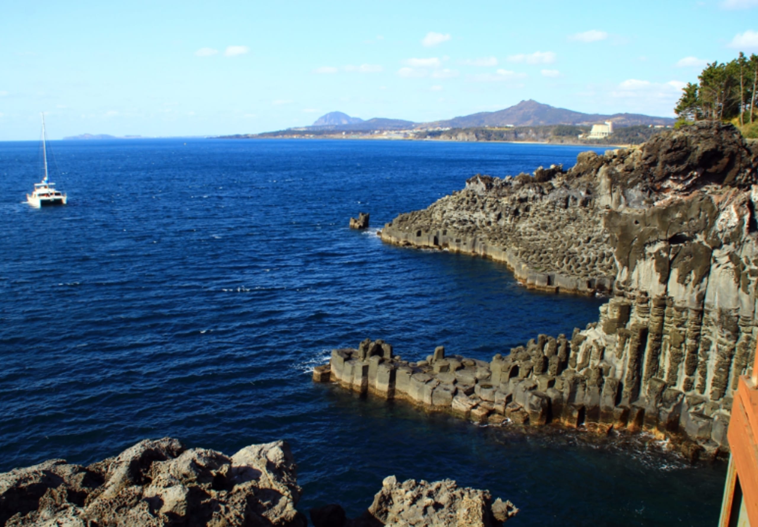 - [Attraction/experience] 12:55, Guided tour, Jusangjeolli Cliff, Jusangjeolli Cliff They look like a large folding screen with black hexagon stone pillars. you will be mesmerized by nature's greatness. Tangerine picking experience(Optional : Winter season)