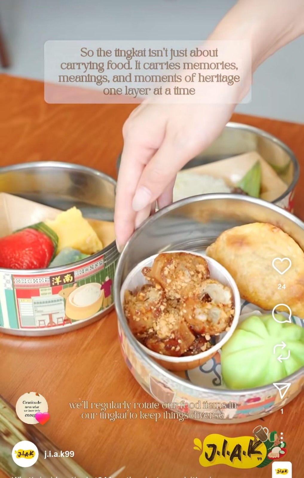 - Food items served high-tea style in a tingkat (tiffin carrier)