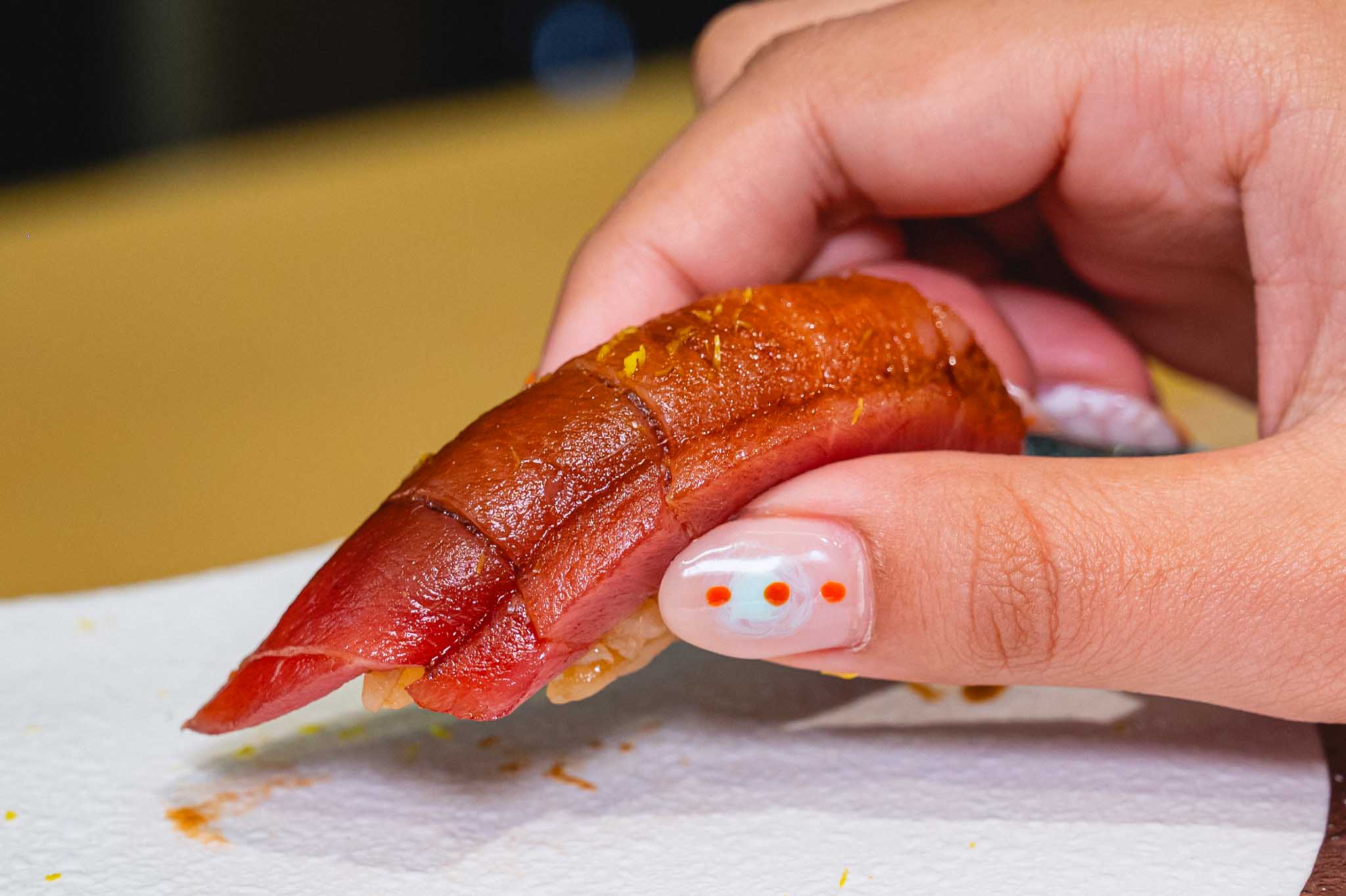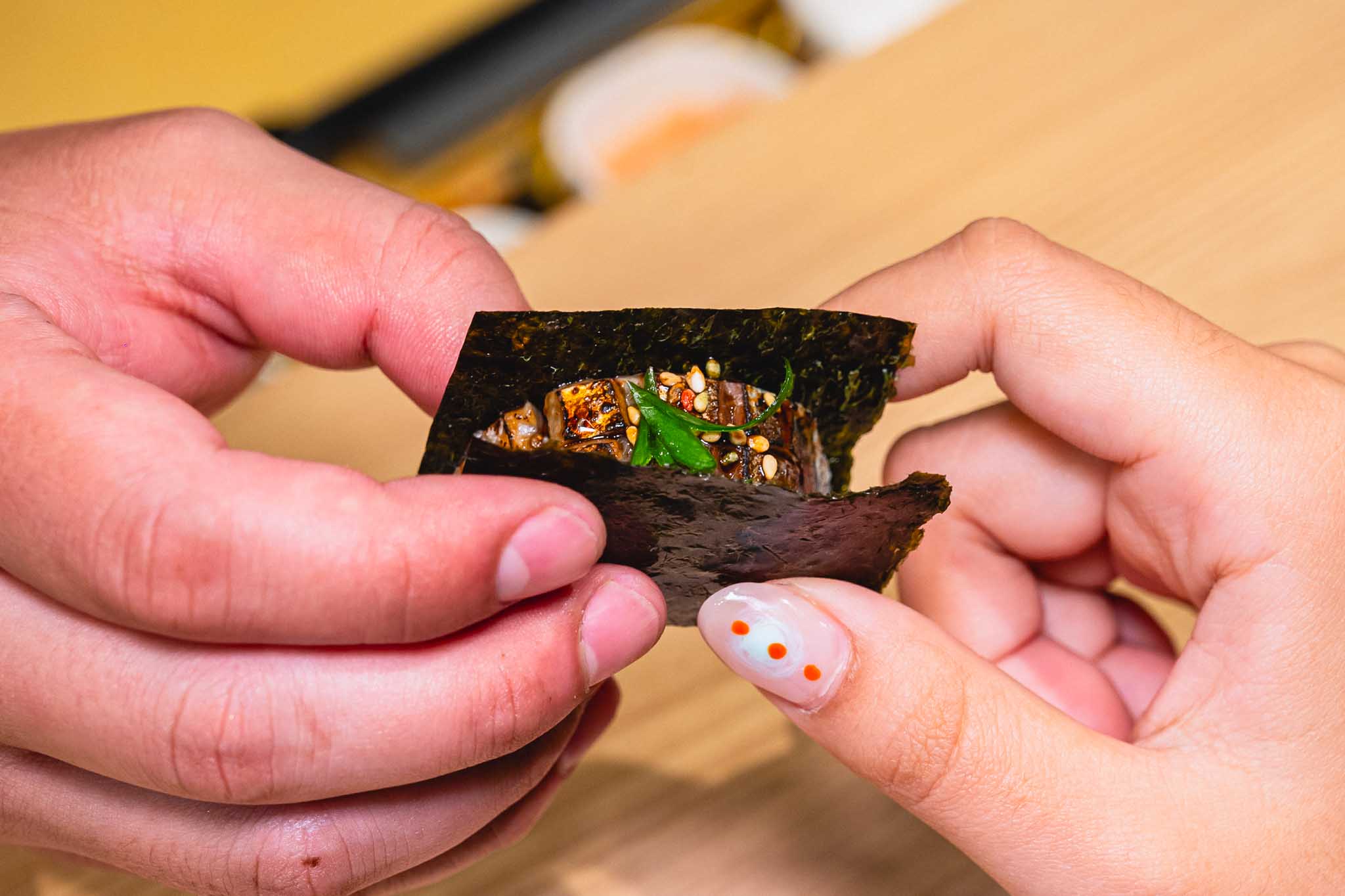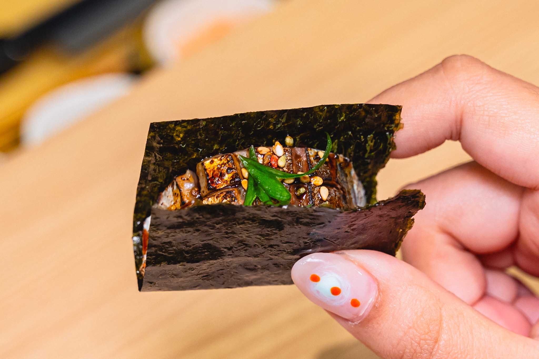 - Delight in unique creations like Namero Shiso Tempura, a crispy and aromatic tempura filled with the bold flavors of Namero and fragrant shiso leaves, and Aji/Sayuri Shoga Negima, a harmonious combination of mackerel, needlefish, and refreshing ginger wrapped in perfection.