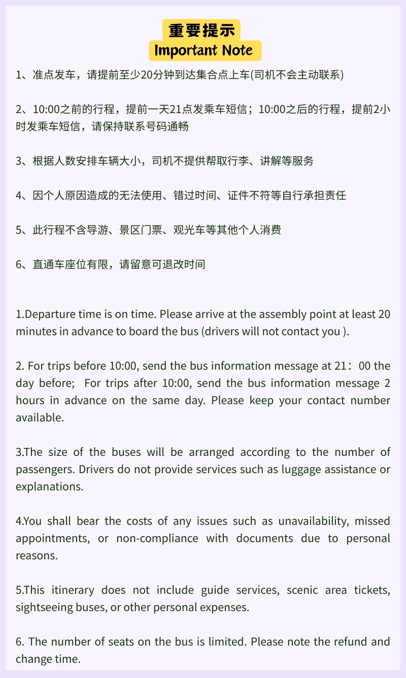- The bus will depart on time, so please arrive at the meeting point at least 20 minutes in advance (the driver will not contact you proactively; especially at Moon Bay parking lot and National University parking lot, due to the large area and many vehicles, please be sure to arrive in advance to find the correct vehicle).