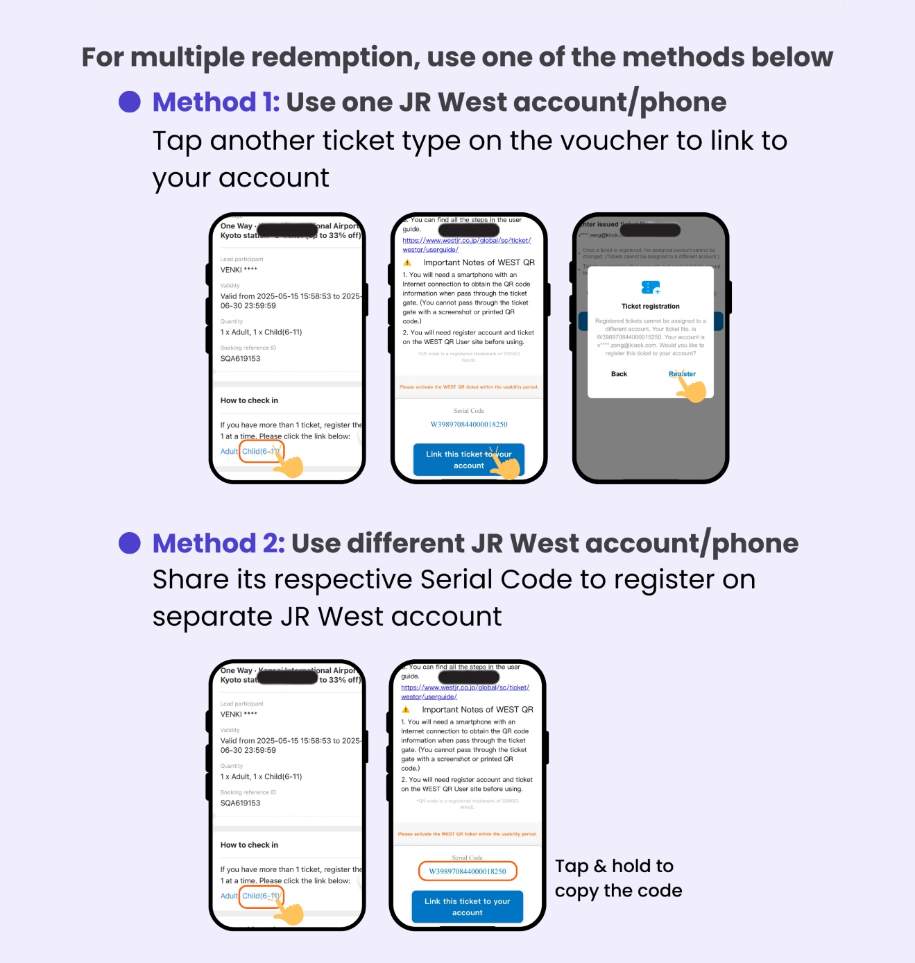 - For multiple tickets in one booking, refer to the guideline to link them to one account to use together, or to create separate JR West accounts to use them individually