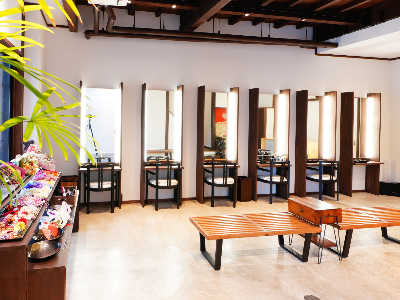 - [For Self Hair Styling Customers]A free space is available, including makeup tools and accessories such as hairpins and hair irons. Five free dressers are provided so groups can enjoy at their own pace.