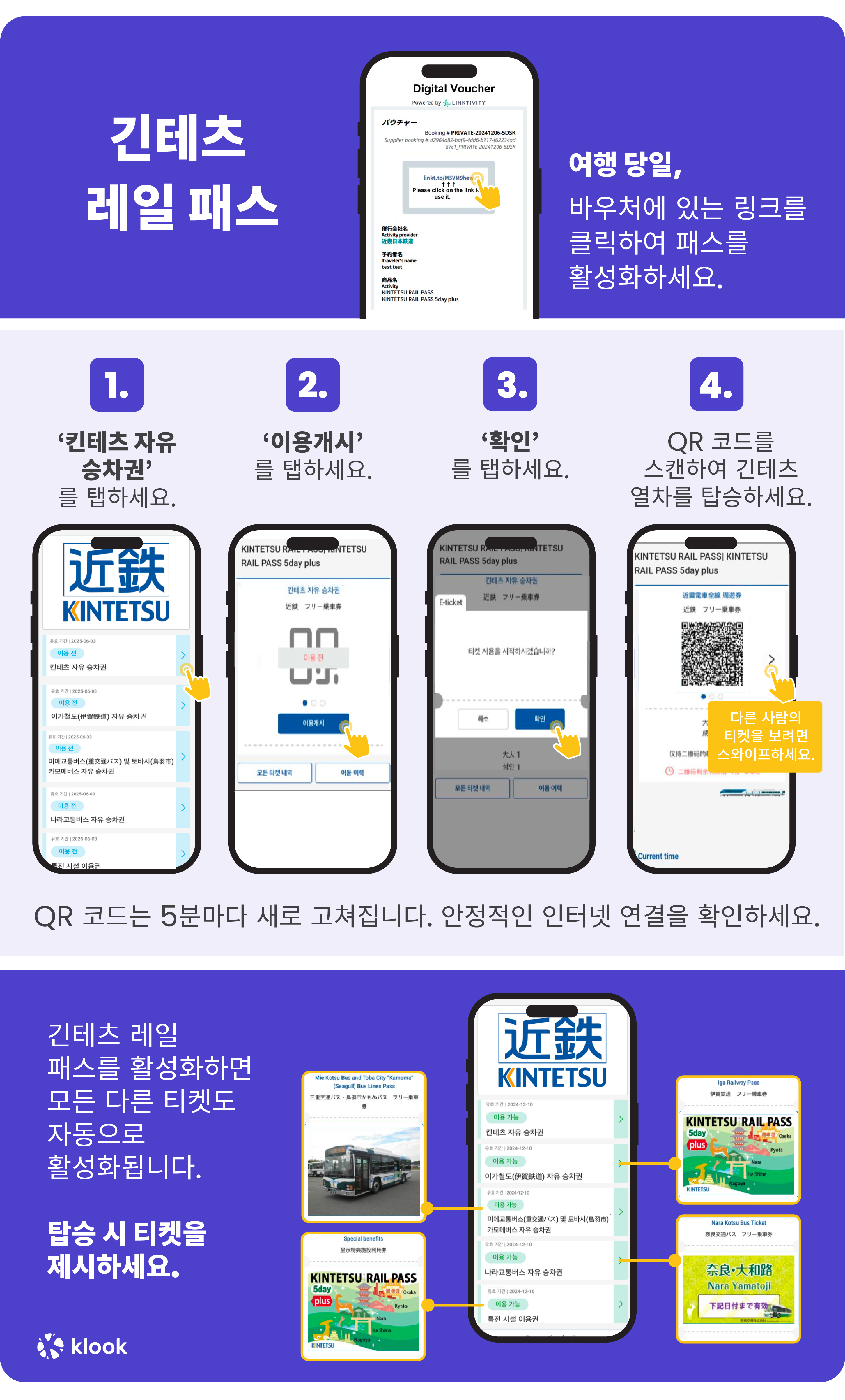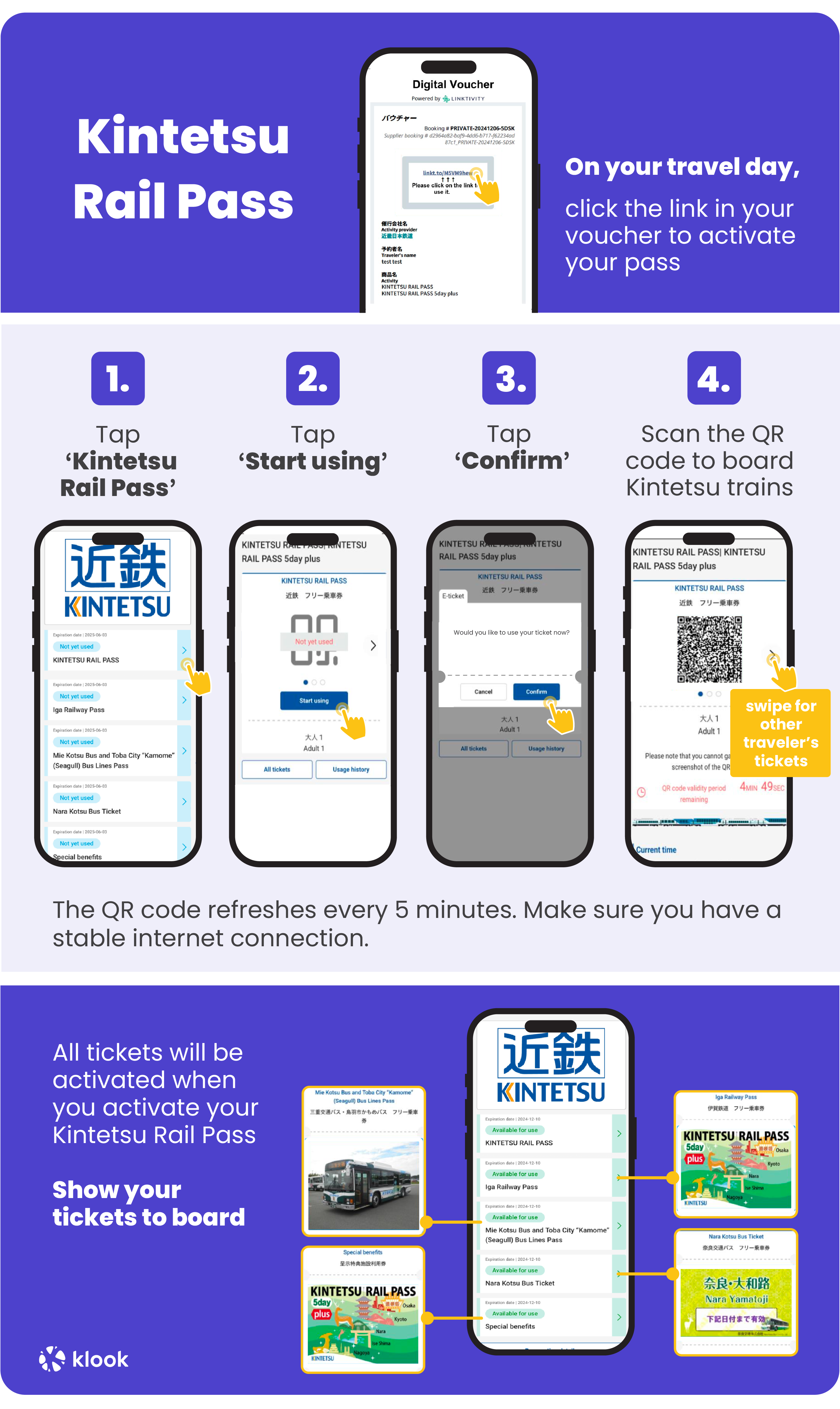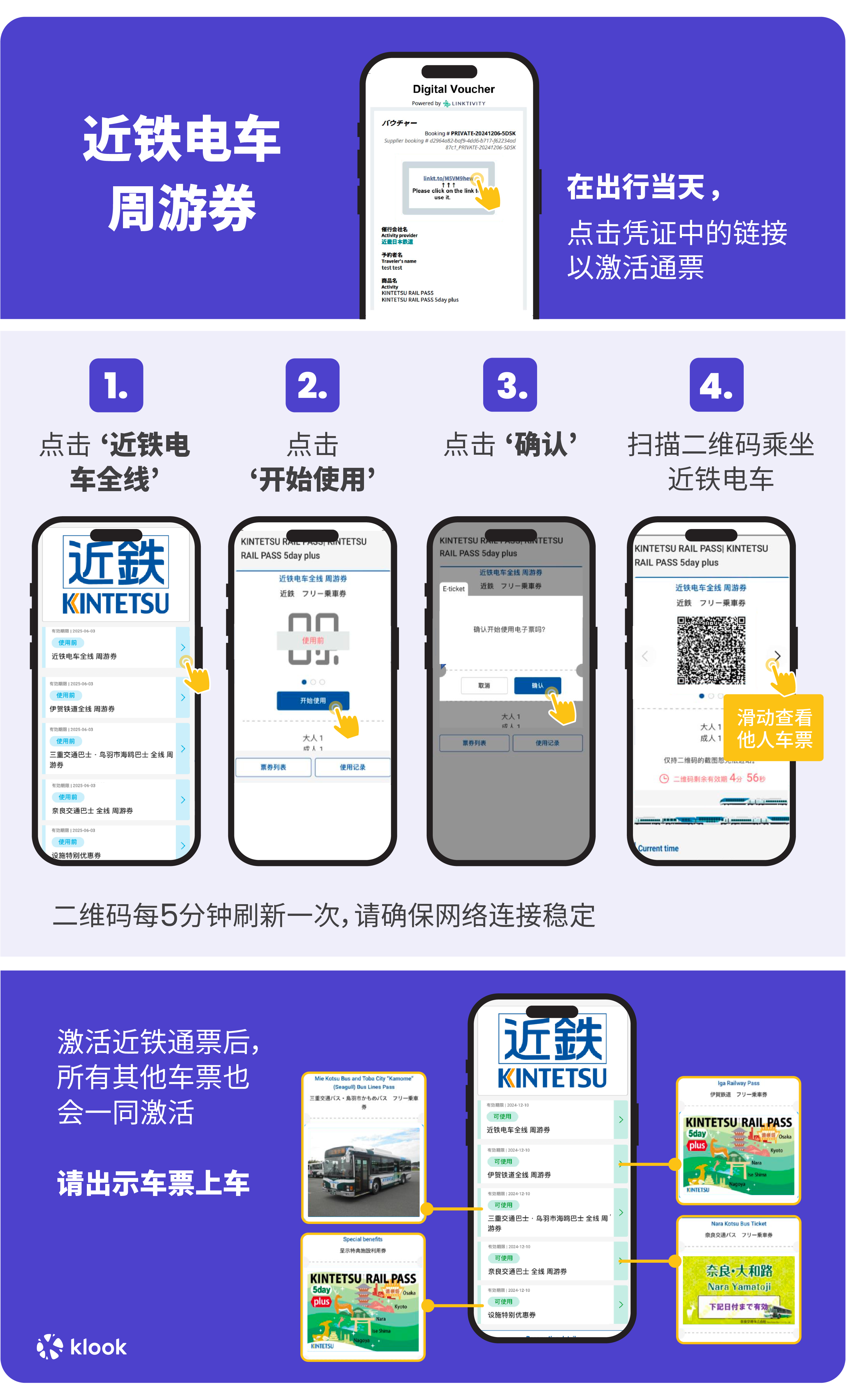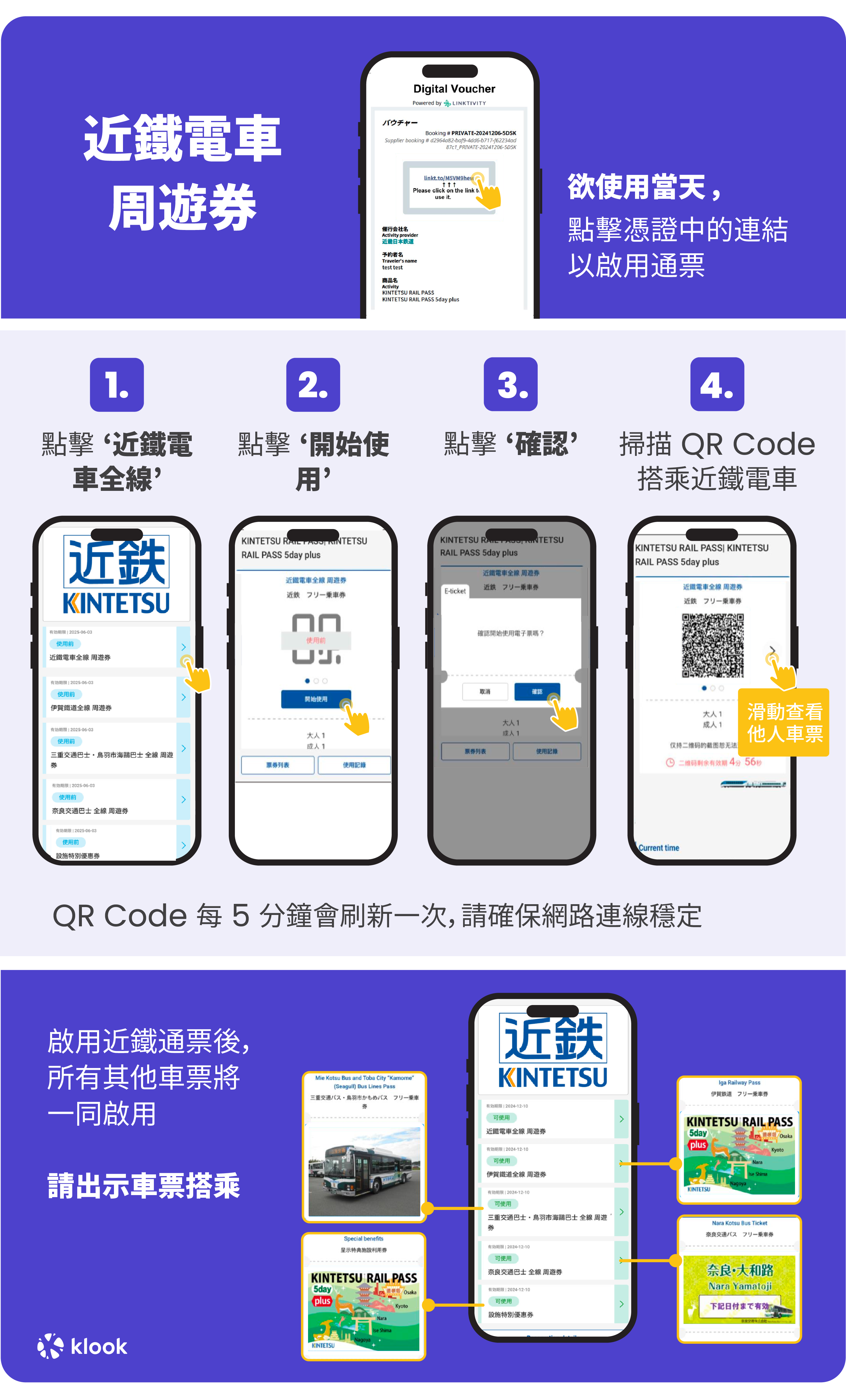 - Unlimited train rides on Kintetsu Railway, Iga Railway, Cable car, Nara Kotsu Bus, Mie Kotsu & Toba City Bus in specified areas ([route map](https://res.klook.com/image/upload/5-day_pass_plus_map_ieohuv.pdf))
