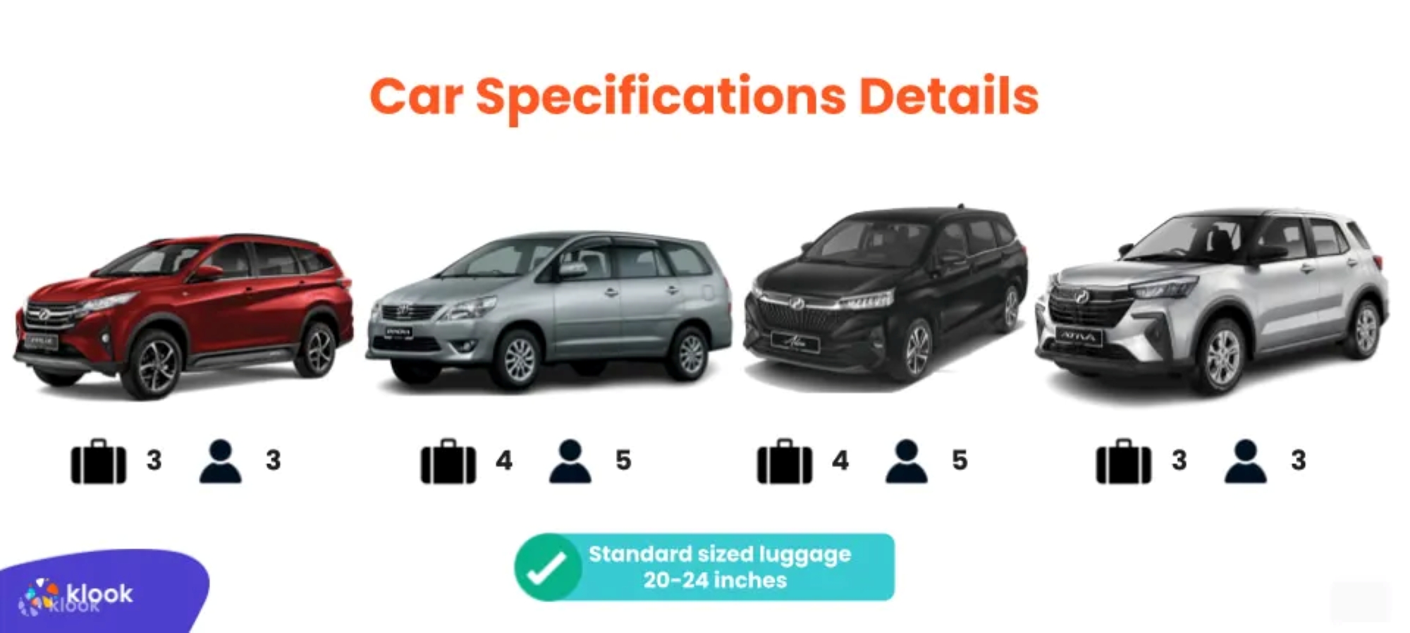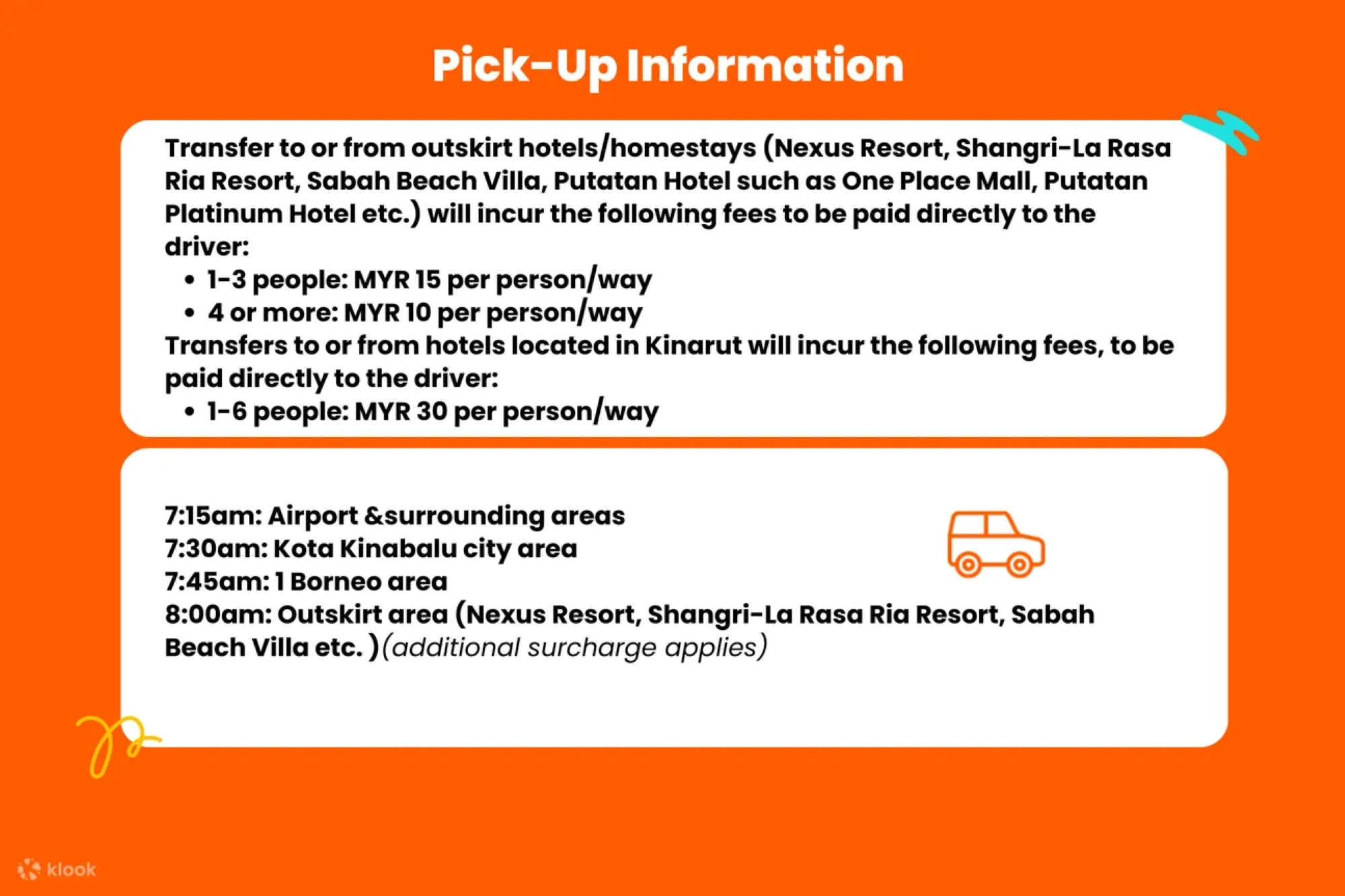 • Pick-up time will start at 7:00 am and service will end by 5:00 pm (MYR80 of surcharge will be incurred if service exceeds 5:00 pm)