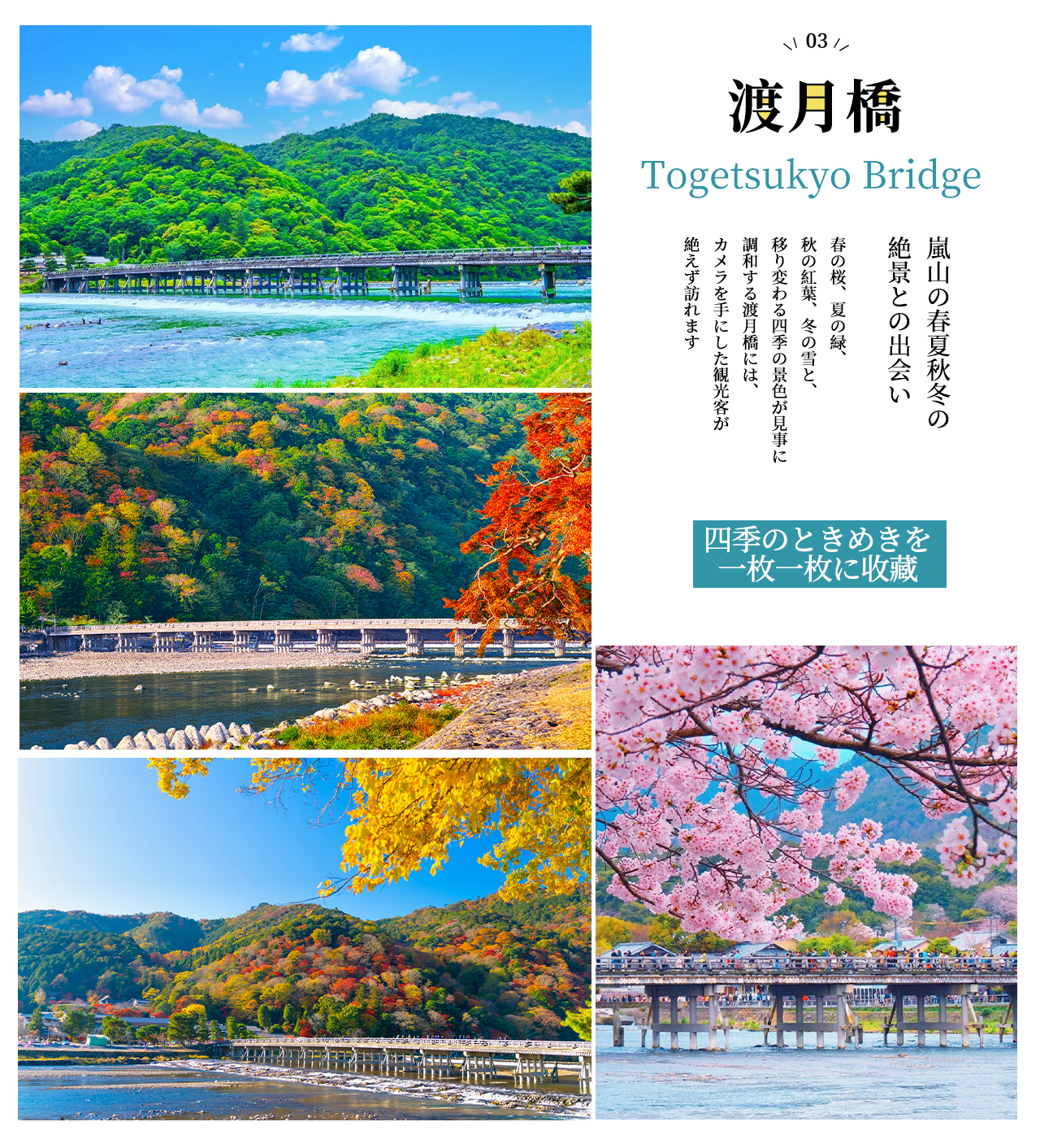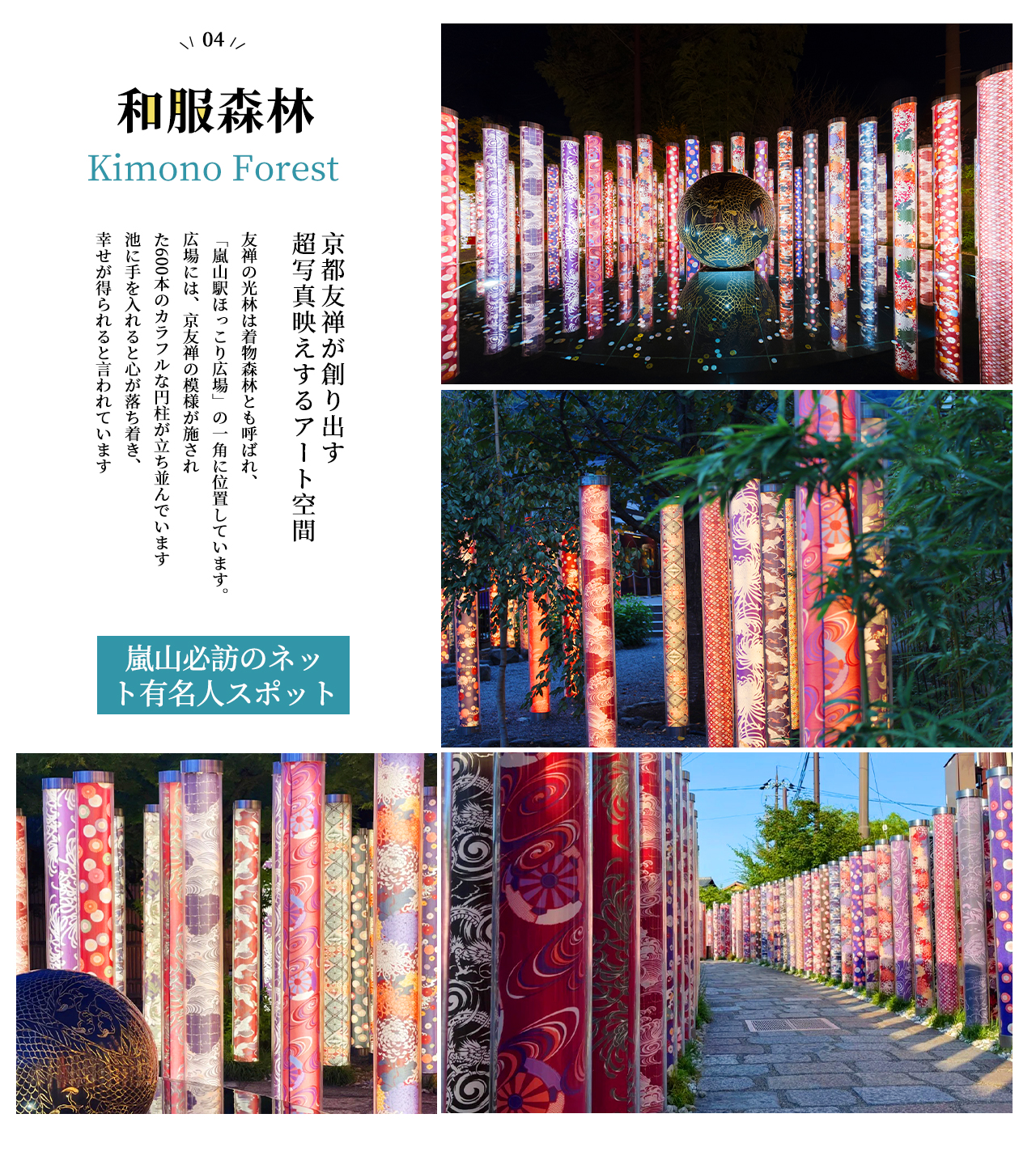 • [Attraction/experience] 14:50, 2 hour(s), Self-guided, Togetsukyō Bridge, Kimono Forest, Bamboo Forest Trail, 【Arashiyama Area】During free time, the following attractions are recommended: Togetsukyo Bridge, Kimono Forest, Arashiyama Bamboo Grove. This product does not include the Sagano Scenic Railway tickets. If needed, you can purchase tickets for the 15:02 departure (Sagano No. 13) and the 15:30 return (Sagano No. 14)..Some attractions might need to skipped because of capacity or weather conditions
