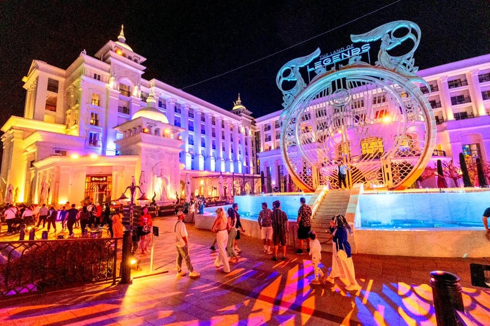 - [Attraction/experience] Guided tour, The Land of Legends, Arrive at Land of Legends, enjoy a dazzling night show, then explore the park, dine, or ride attractions—includes roundtrip transfer from Belek for a magical evening out.