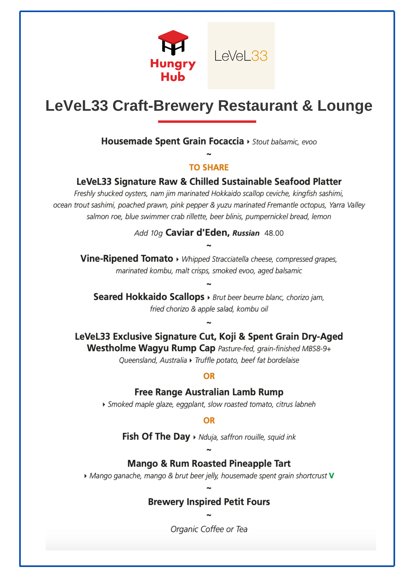 - Elevate your dining experience with the exquisite 6-Course Contembrewery Menu, perfectly paired with a 300ml glass of LeVeL33 Brut Beer