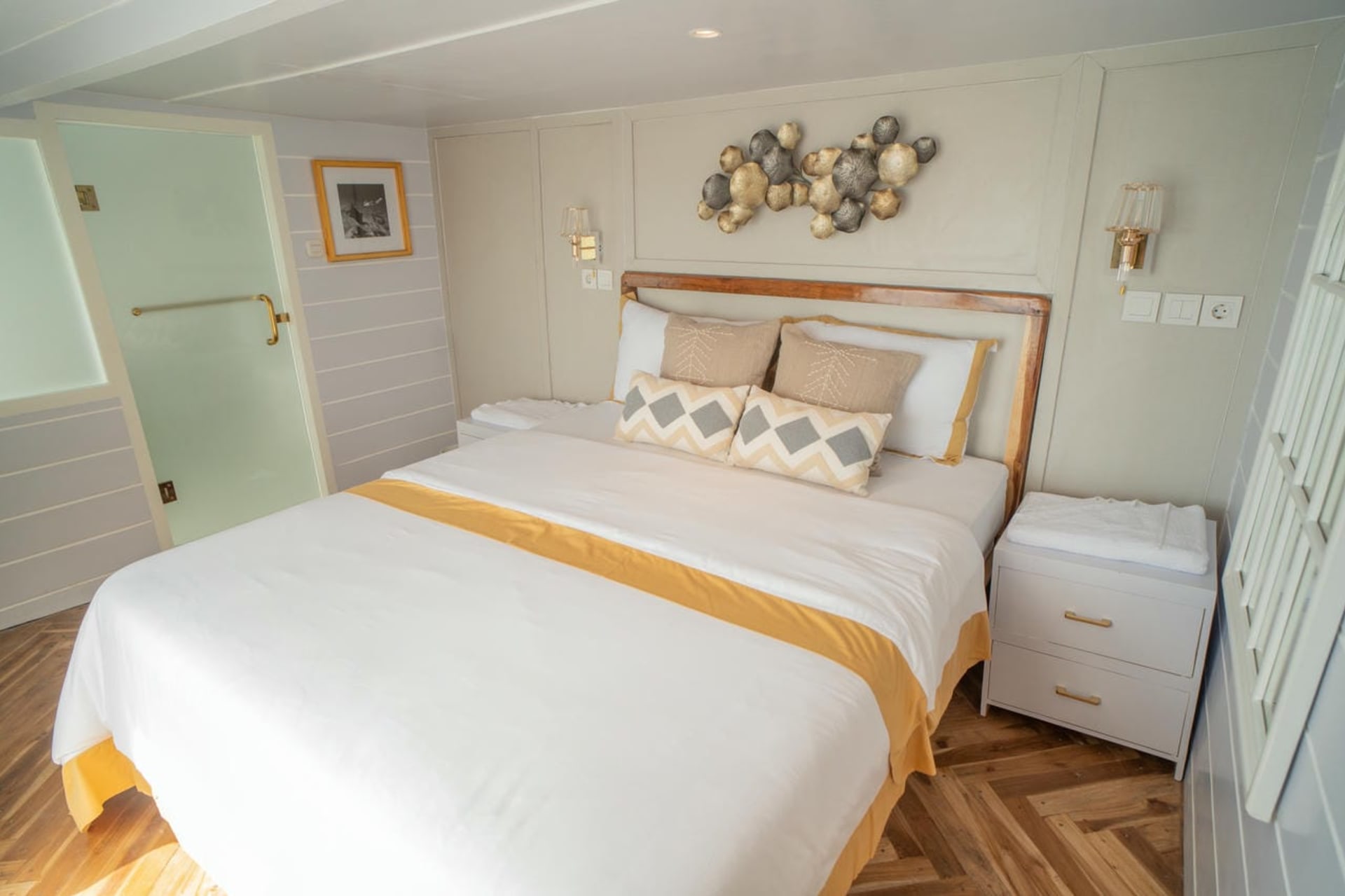 - Master cabin: 30 sq.m, Queen Bed, sea/ocean view, free wifi, bathtub, balcony, private bathroom, AC (Air-conditioning room)