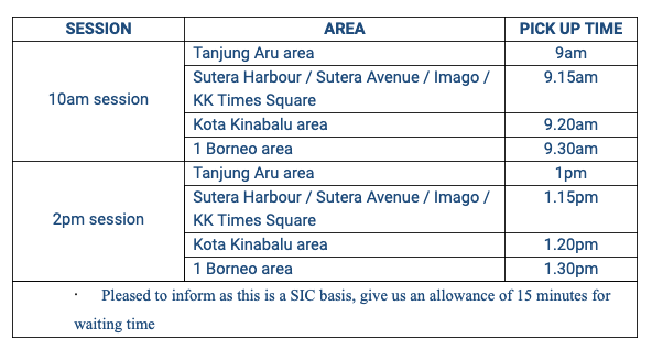 - An additional surcharge of MYR30 per person will be incurred for outskirt areas (etc. Kinarut, Rasa Ria Resort). Please pay to the driver directly