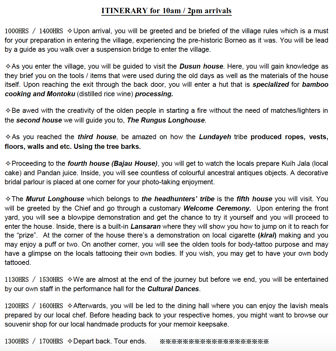 - Departure: Get picked up at . Enter your preferred location at checkout. The operator will make the final confirmation accordingly. You can choose to depart at the following times: 09:00, 13:00. Make sure you take part at the time you selected at booking, Kindly advise us your hotel name for pick up. Any pick up from outskirt area (Kinarut, Rasa Ria Resort) will be with additional MYR 30 per person.