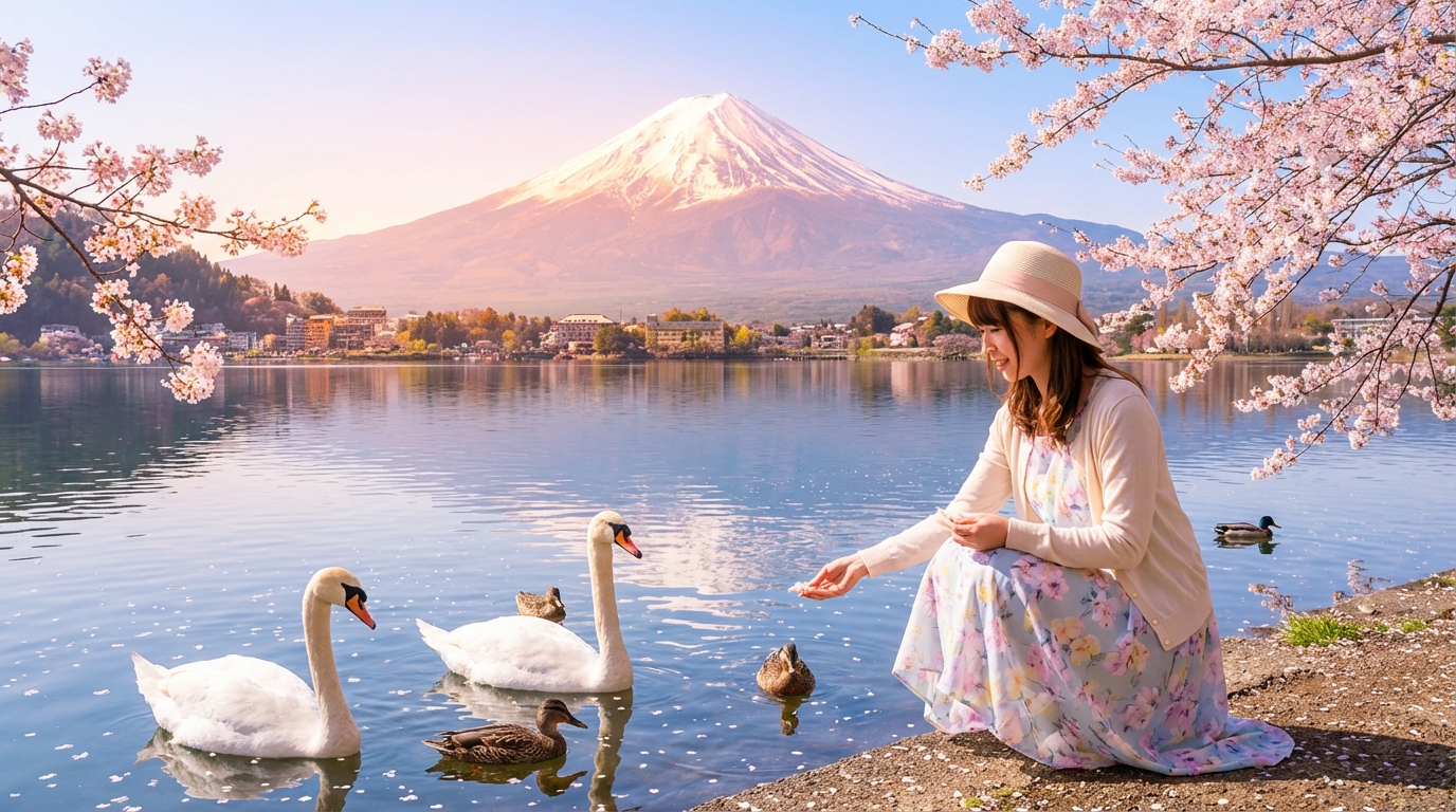 - [Attraction/experience] 10:00, 40 min(s), Self-guided, Lake Yamanaka, Lake Yamanaka is not only one of the Fuji Five Lakes, but also known as "Swan Lake." Every winter, a large number of white swans gather here, and together with the stunning scenery of Mount Fuji, they form a tranquil picture. Visitors can buy feed by the lake to interact closely with the swans, feed them, and take photos.