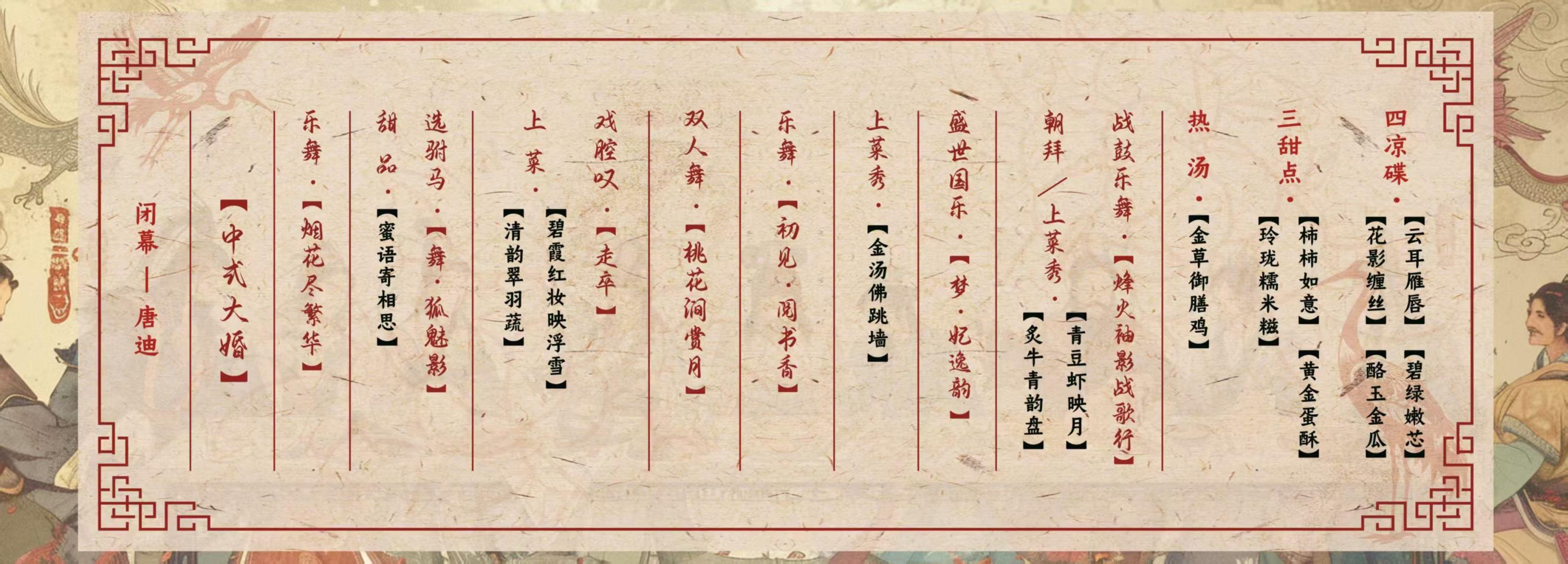 - [Gala Dinner] 1. 17:00 (Guests requiring makeup and hairstyling arrive). 17:30 Arrive at Nanyao Yijing (Guests not requiring makeup and hairstyling arrive to verify seating information). Receive the following: 1. Your identity token for the day. Please keep it safe and do not lose it, as it is also your entry token to the "Nanli Hall" for the Qionglin Imperial Banquet. 2. Startup funds for the game. Be careful not to be stolen or cheated! All games require payment of silver to play. You can earn silver and exchange it for corresponding rewards. Be sure to ask each shopkeeper if there are any hidden tasks, there may be unexpected surprises! 2. In order to provide all adults (princesses) with a better experience, Nanyao Yijing offers costume change and makeup services. You can purchase corresponding vouchers and go to the "Makeup Division" to change into beautiful ancient costumes and gorgeous hair accessories after receiving the token voucher at the Nanyao Yijing front desk (storage cabinets are available to store your clothes and valuables). To ensure the costume changing experience for all adults and masters, all costumes in our store are washed and disinfected for each guest. Please feel free to choose. 1. During the game, there will be the sound of gongs, which is the NPC performing the main storyline. You can stop and take a break to observe what has recently happened in the country of Nanyao. 2. The game time is approximately 60 minutes. 3. At 19:10, the NPC will guide you (princesses) to Nanli Hall for the Qionglin Imperial Banquet to taste the delicacies carefully prepared by the imperial chefs. 4. 19:30 Banquet begins. 5. 21:00 Closing (change clothes, remove hair accessories).