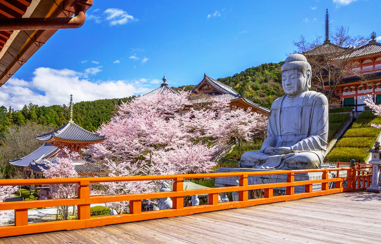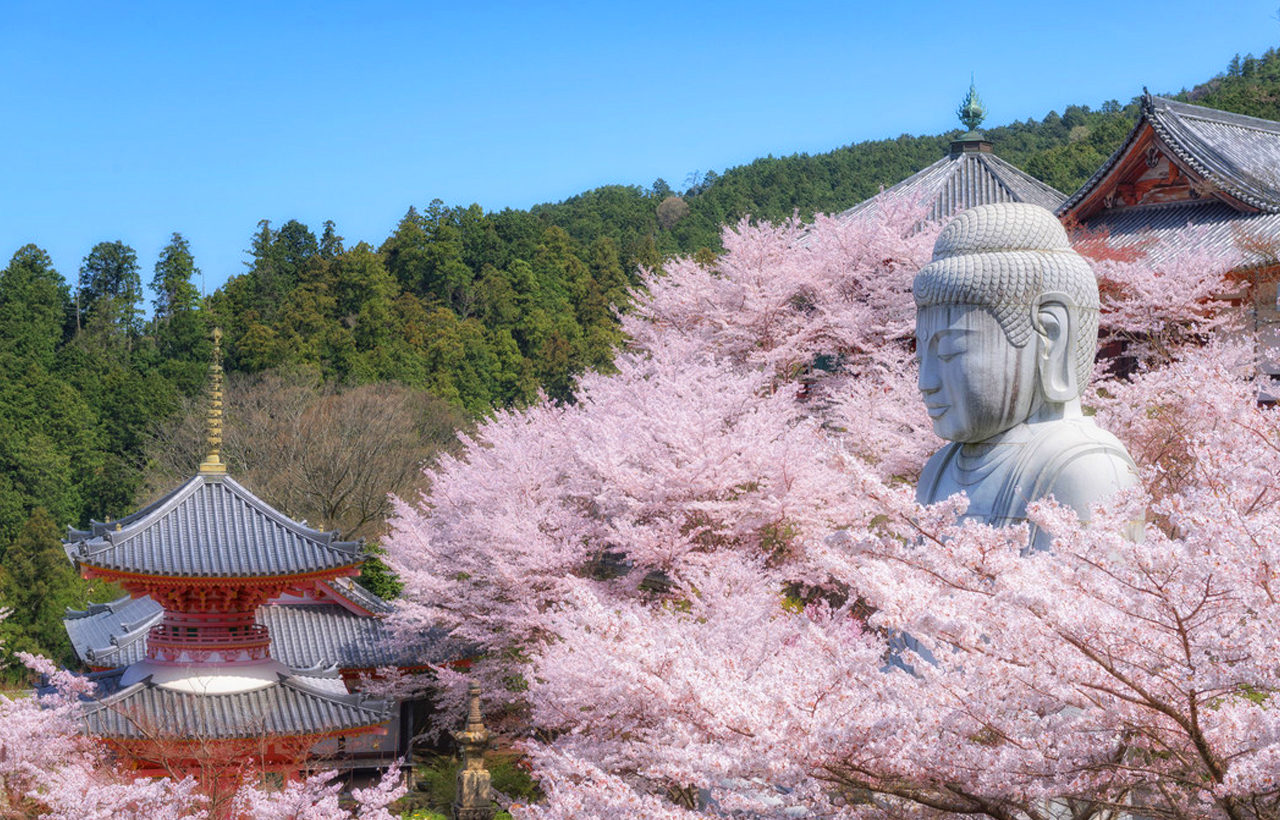 - [Attraction/experience] 13:50, 1 hour(s), Self-guided, Tsubosaka-dera, The mountain temple in Takaichi, Nara Prefecture, is famous for its massive Buddha statue surrounded by cherry blossoms. In spring, when thousands of cherry trees bloom, the 15-meter-tall Tsubosaka Daibutsu sits majestically in a sea of flowers, creating a breathtaking sight. The temple is renowned for its efficacy in praying for eye health and offers a tranquil environment, making it a secret cherry blossom viewing spot away from the crowds.